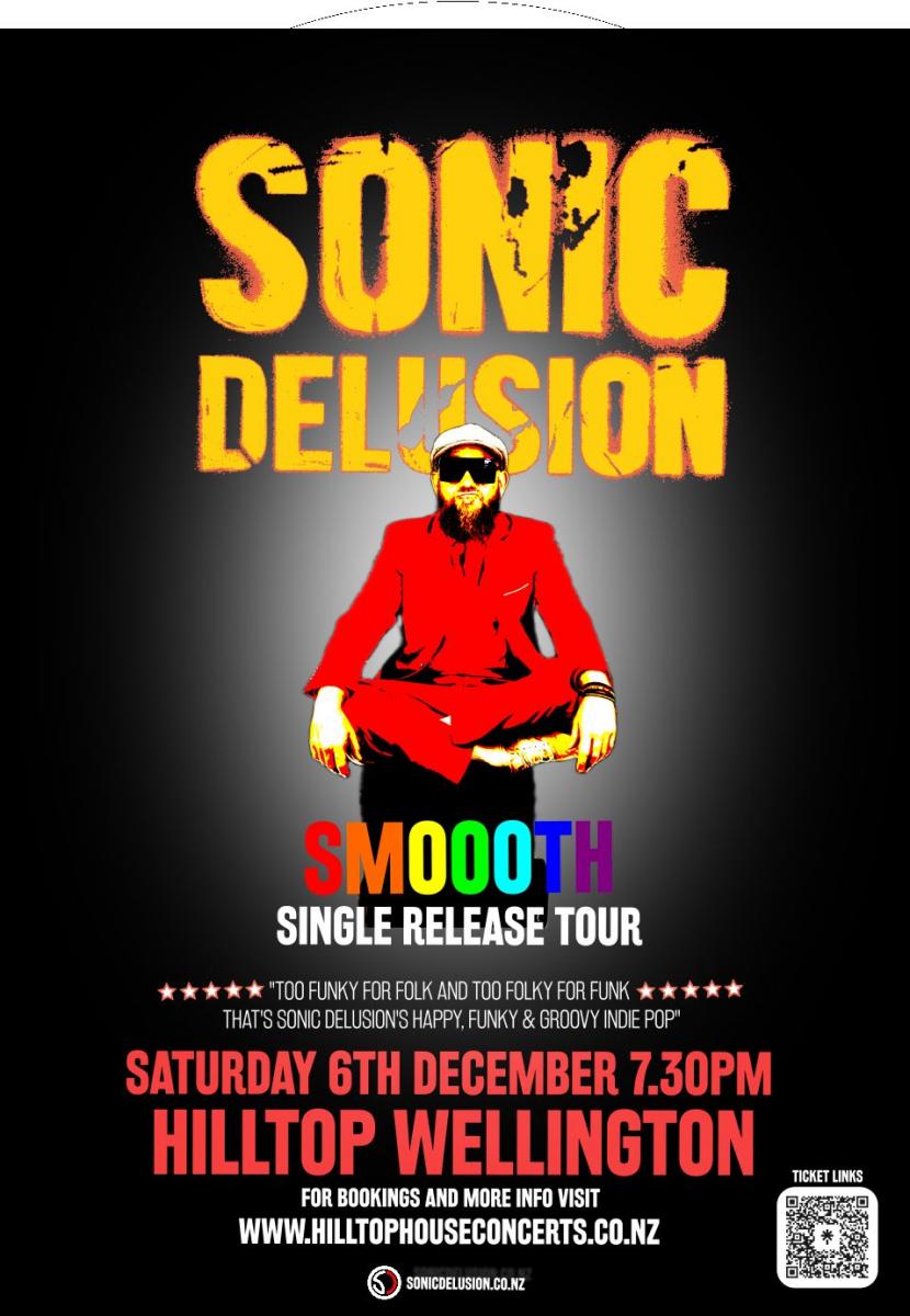 Too funky for folk and too folky for funk — that’s Sonic Delusion’s happy, funky, and groovy indie pop. Saturday 6 December 7.30pm. Celebrating the release of André Manella’s new single “Smoooth”, the vibrant Swiss-Kiwi performer is armed with his trusty loop pedal and an array of … View moreToo funky for folk and too folky for funk — that’s Sonic Delusion’s happy, funky, and groovy indie pop. Saturday 6 December 7.30pm. Celebrating the release of André Manella’s new single “Smoooth”, the vibrant Swiss-Kiwi performer is armed with his trusty loop pedal and an array of instruments. Sonic Delusion layers beats, baselines, and melodies into a boogielicious live performance “bursting with more funk than folk can handle.” With over 1500 shows played across Switzerland, New Zealand, Australia, and Germany, André has built a reputation for turning every gig into a feel-good party — “funny, fresh and funky… a welcome breath of entertainment, joy, fun and smiles” Graham Reid – Elsewhere. From Taranaki to the lower North Island, the “Smoooth” release tour promises catchy hooks, infectious grooves, and the perfect excuse to shake your worries away. “catchy melodic hooks that make you want to get up and dance” Amy Maynard – NZ Musician Magazine