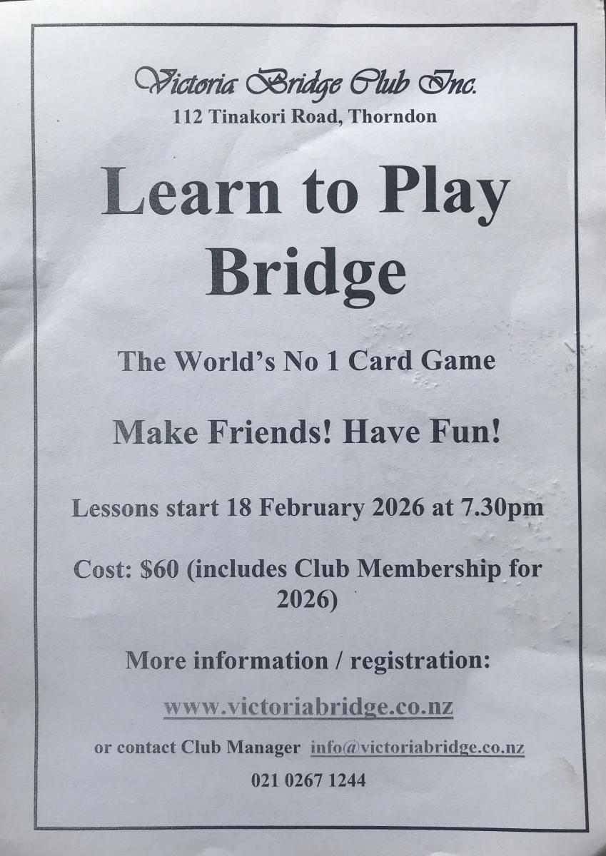 Bridge lessons at Victoria Bridge Club in Thorndon. Starting 18th February 2026. All welcome.