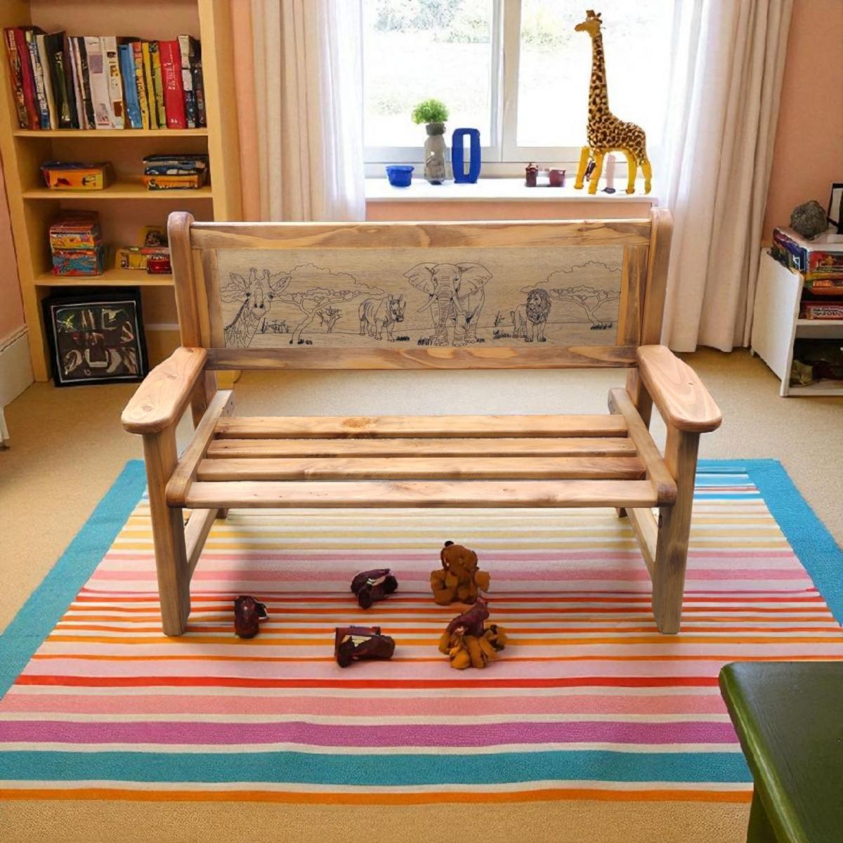 Size: Length 865mm, Floor to top of … View moreBeautifully hand crafted child's bench seat with animal detail created by Rangiora Menz Shed. Stained, durable and strong. They look amazing. Your kids will love it.