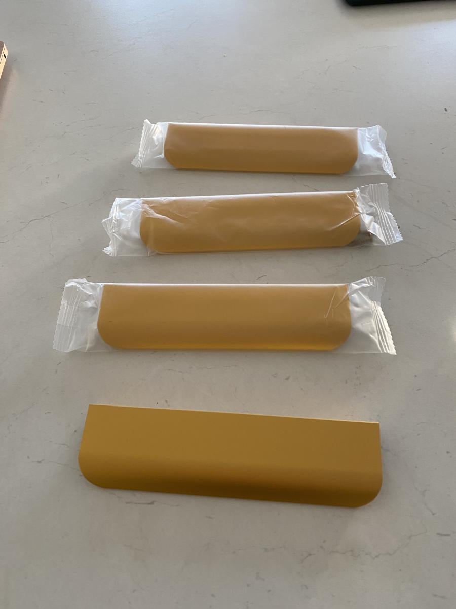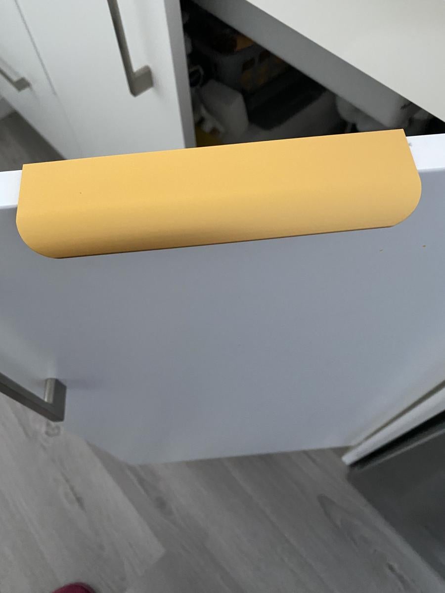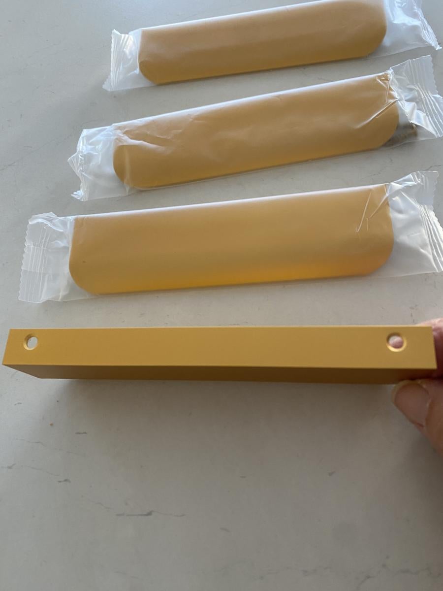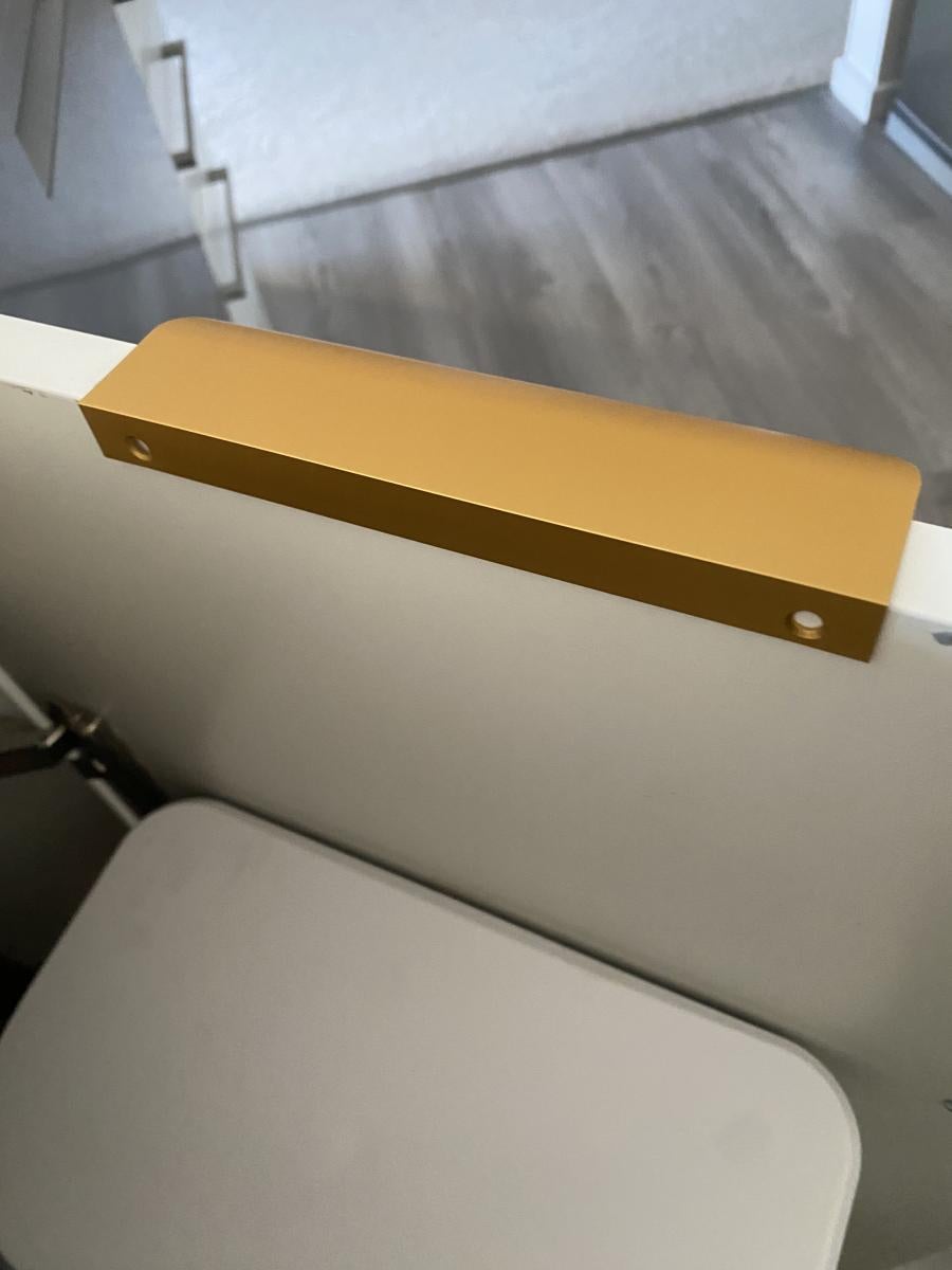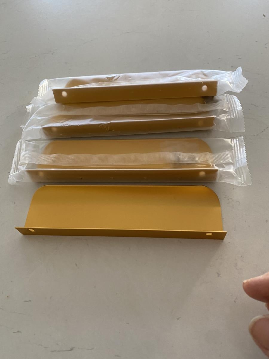4 Metal Bronze/gold door or drawer handles. Holes already drilled 13cm apart. Total length of handles 15cm. brand new with screws.
