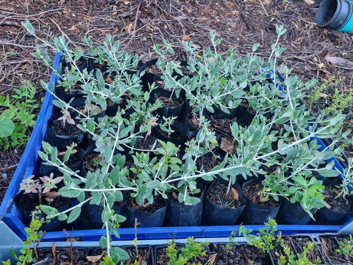Fast-growing, spreading, drought-tolerant grey shrub. Attractive hedge with pale-blue bee-attracting flowers. Looks great as a trimmed shrub, low shelter or topiary. Great on coastal sites. Evergreen. Hardy. Lots available.$3 per plant