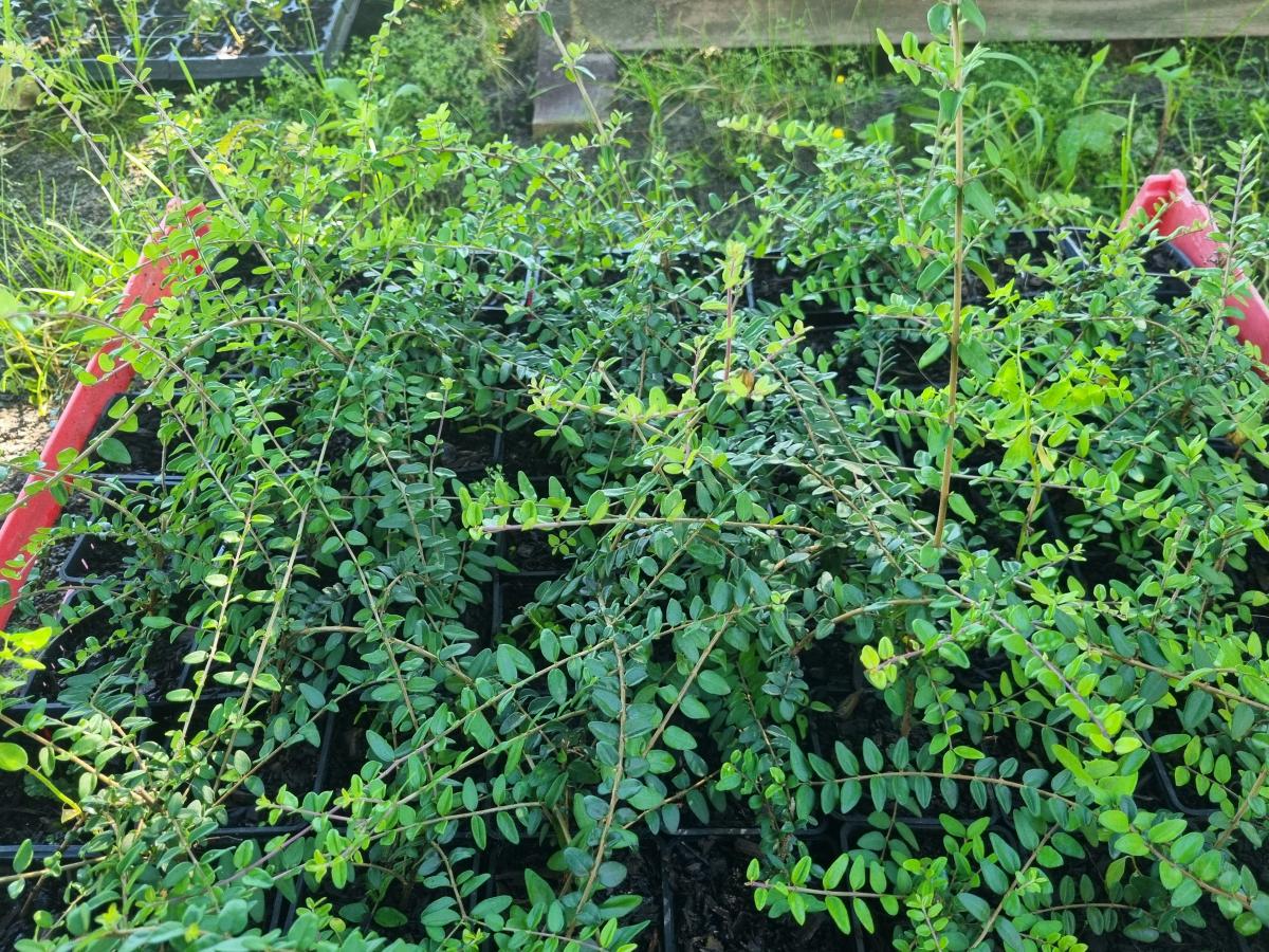 Fast-growing, spreading, drought-tolerant grey shrub. Attractive hedge with pale-blue bee-attracting flowers. Looks great as a trimmed shrub, low shelter or topiary. Great on coastal sites. Evergreen. Hardy. Lots available.$3 per plant