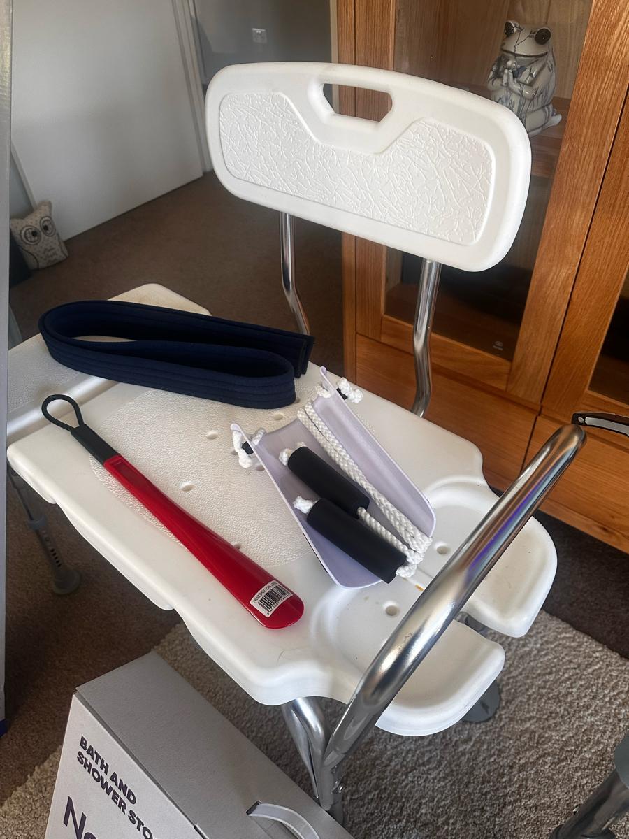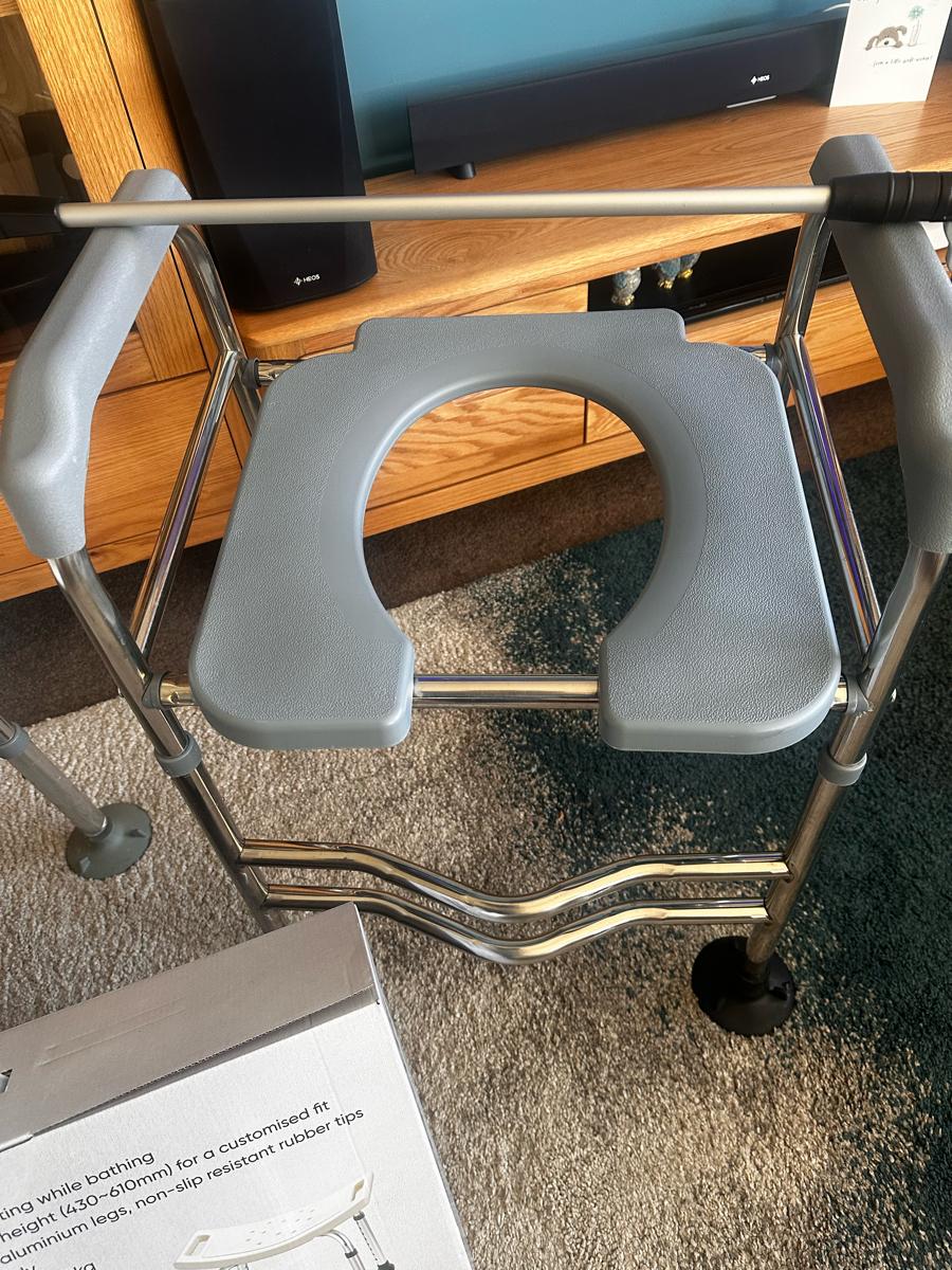 Raised toilet seat frame. Quite snug for me but i am 117kg but i … View moreAre you having hip replacement surgery soon. Picture is a collection of equipment you will need at home.