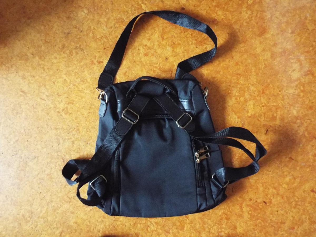 Black Poaba brand, ladies backpack, with zipped pockets, single and double shoulder straps options. Lovely, fashion accessory. New price - $78.