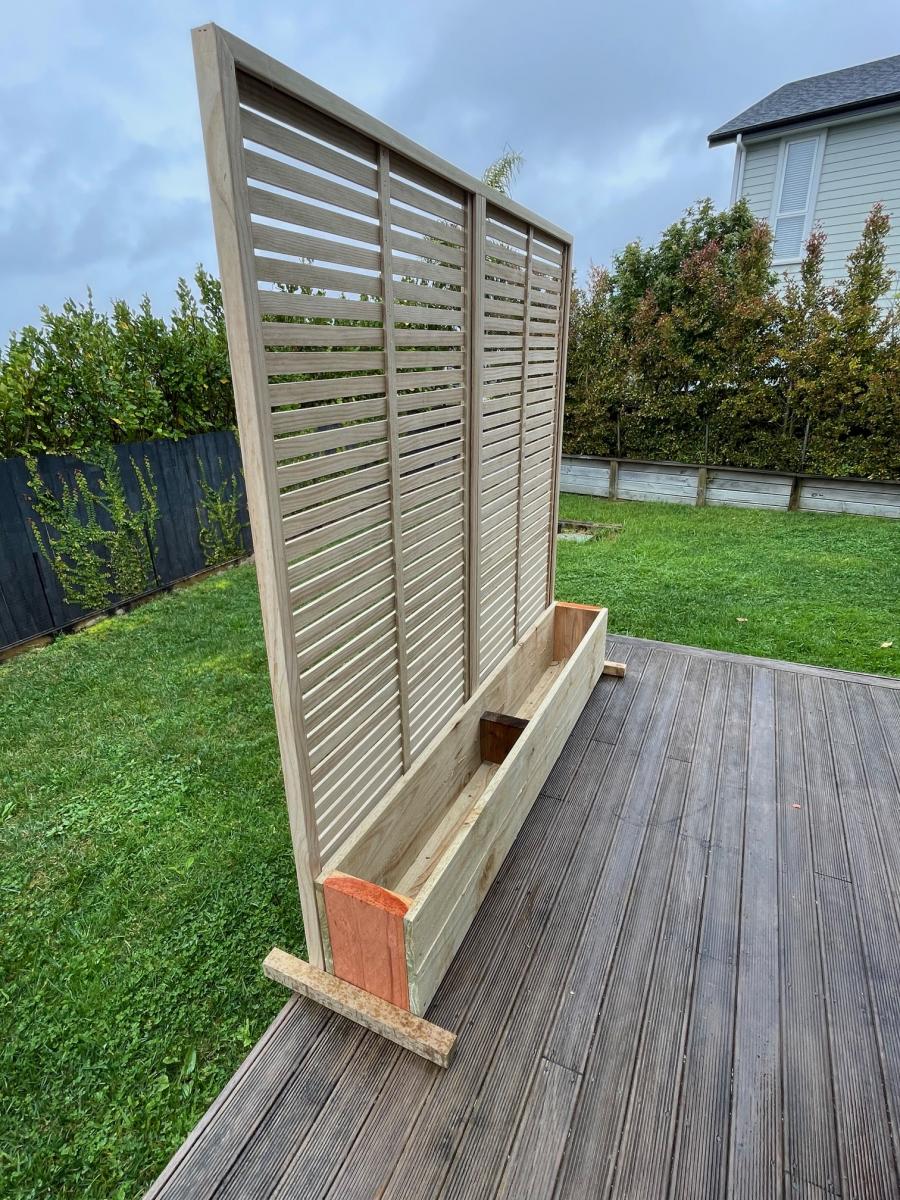 Trendy rough-sawn planter box complete with trellis screen.