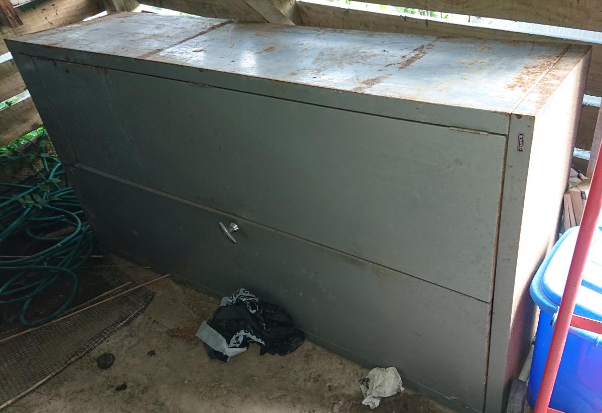 Metal cabinet, suits basement or workshop, with shelves. Minor surface rust, but obviously has a lot of life left in it. On the photo it's shown lying on its side, because it's too high for my basement.