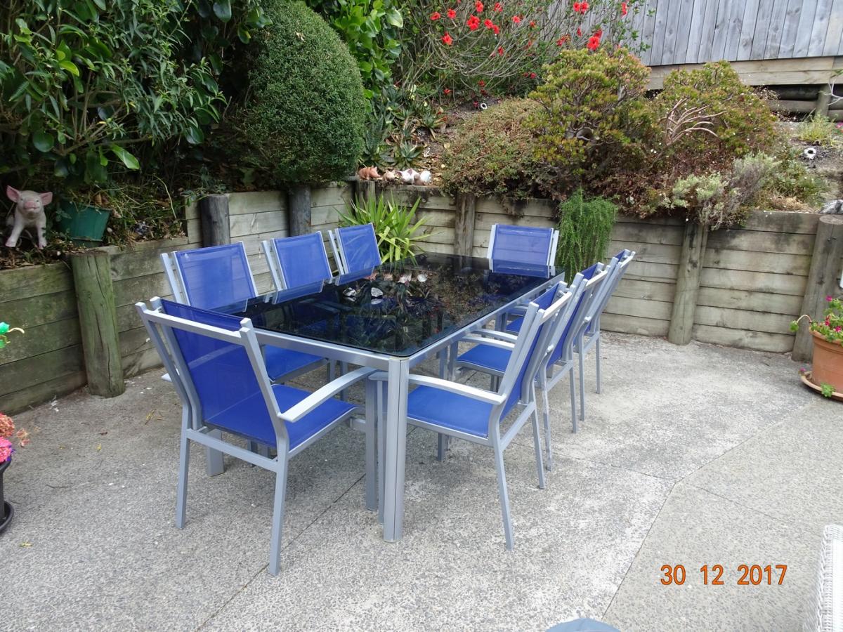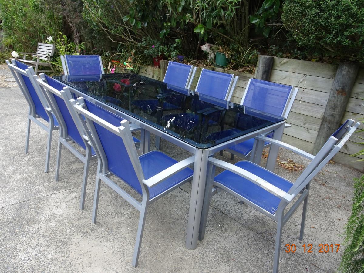 Glass Top Outside Table ( 2400 x 1000 ) in great condition, plus 8 chairs - see photo - Powder Coat on chairs is flaking in places .