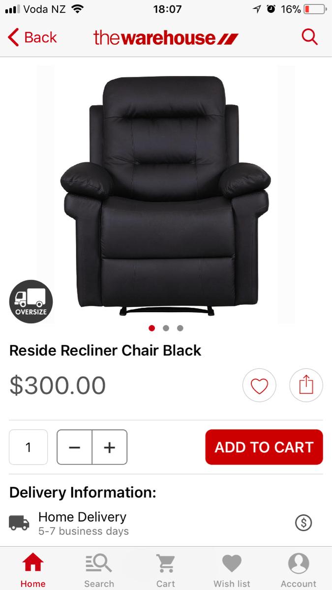 Reside Recliner Chair Black was purchased from the warehouse over a year ago, hardly used, as new condition. Surplus now. $100.