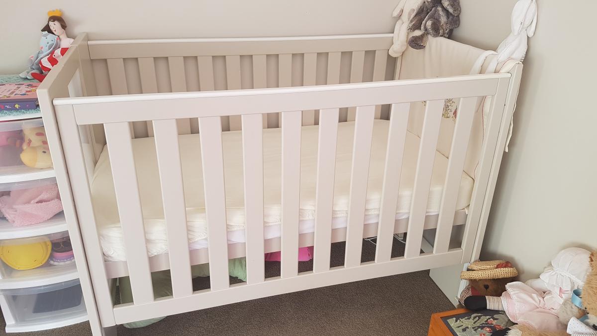 Stylish designer cot with frosted ends and chew guards, in neutral taupe colour. Would suit any nursery decor