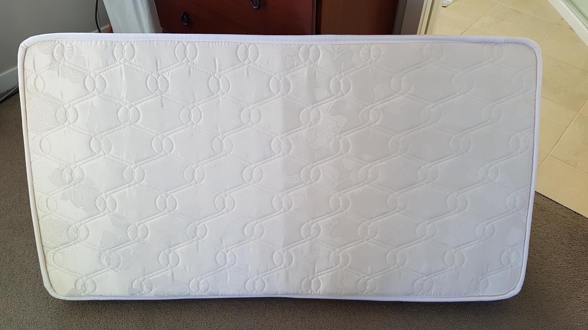 Comes with pristene innersprung mattress, always been wrapped in plastic but unfortunately I tore it while disassembling the cot. Also always had mattress protector on top of plastic.