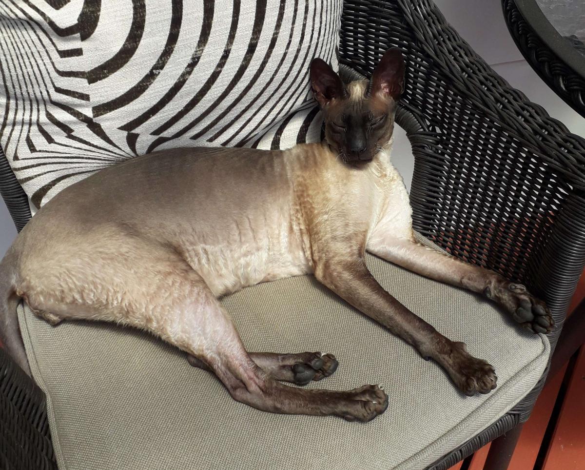 Seal Point Cornish Rex (black face, tail, legs, off-white tummy)