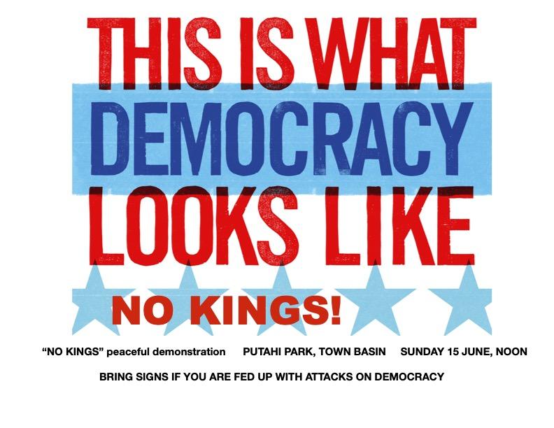 There's a "No Kings" protest happening this weekend in the US and worldwide, and there are over 2000 events are registered so far. I may end up standing alone, but I will be in Putahi Park in Town Basin this Sunday at NOON to show solidarity with the hundreds of thousands of … View moreThere's a "No Kings" protest happening this weekend in the US and worldwide, and there are over 2000 events are registered so far. I may end up standing alone, but I will be in Putahi Park in Town Basin this Sunday at NOON to show solidarity with the hundreds of thousands of protesters in the US. As a native Californian, I cannot sit by by and watch the people of my former home be attacked by the military. Join me if you like...and bring a sign, play some music, or share some snacks! District Council has given me the green light for this gathering. Thanks!
