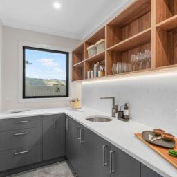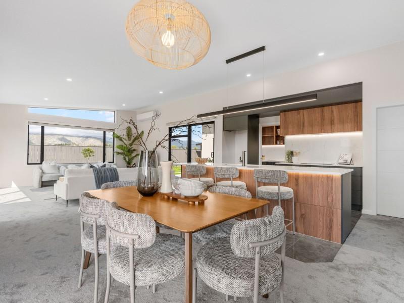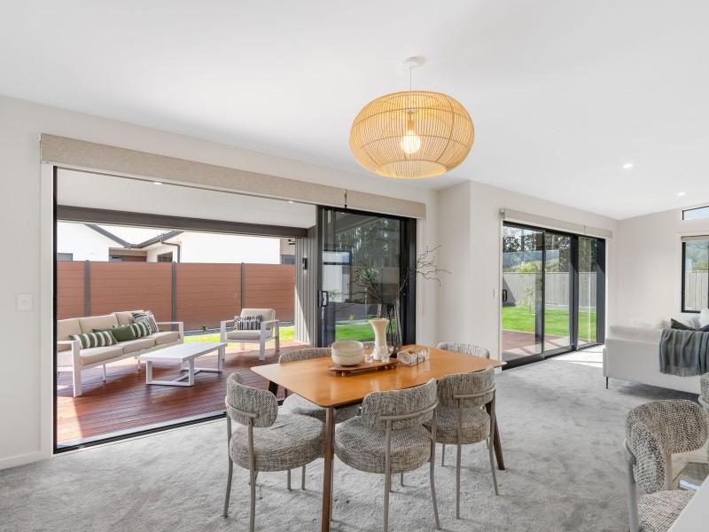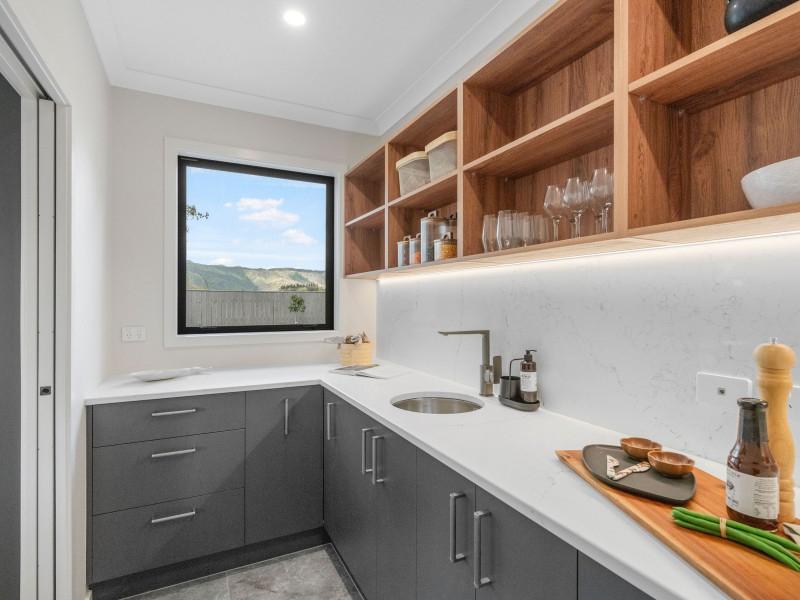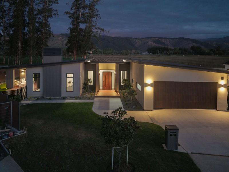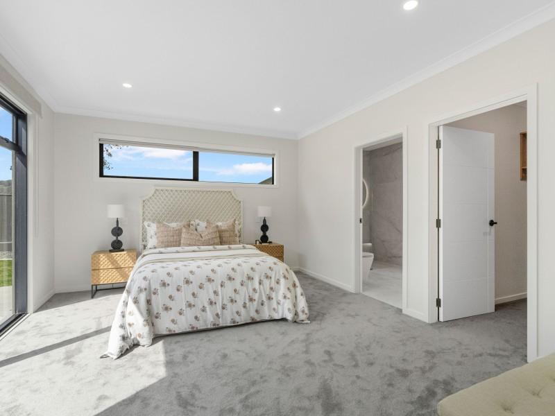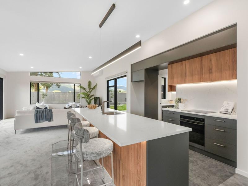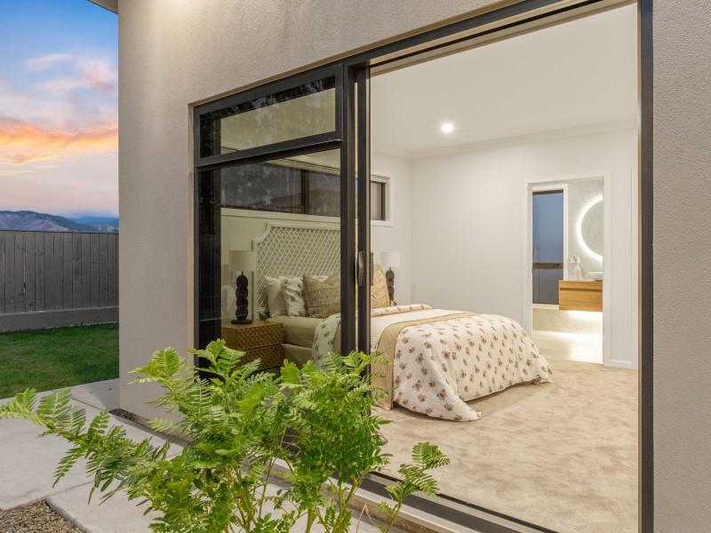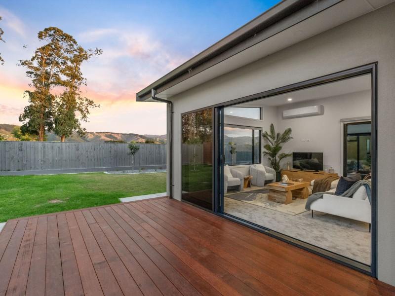 Step inside and be greeted by an expansive grand entrance and extra-wide hallways that lead you into vast open-plan living spaces. Three oversized sliders peel back almost the entire northern wall, inviting the outdoors in and framing sweeping vistas of the Tararua Ranges to the West. Here, summer entertaining becomes something special - the soft rustle of gum trees and the tranquil sounds of tui forming the perfect backdrop to evenings with family and friends.