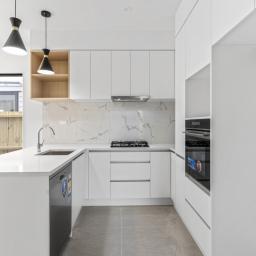 Ground Floor: Open plan living with heat pump for all season living. The living opens to a fully fenced outdoor area. Modern kitchen with gas cooking & ample bench space /storage. Guest W/C on this level + single garage with laundry.
