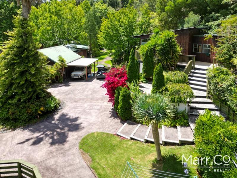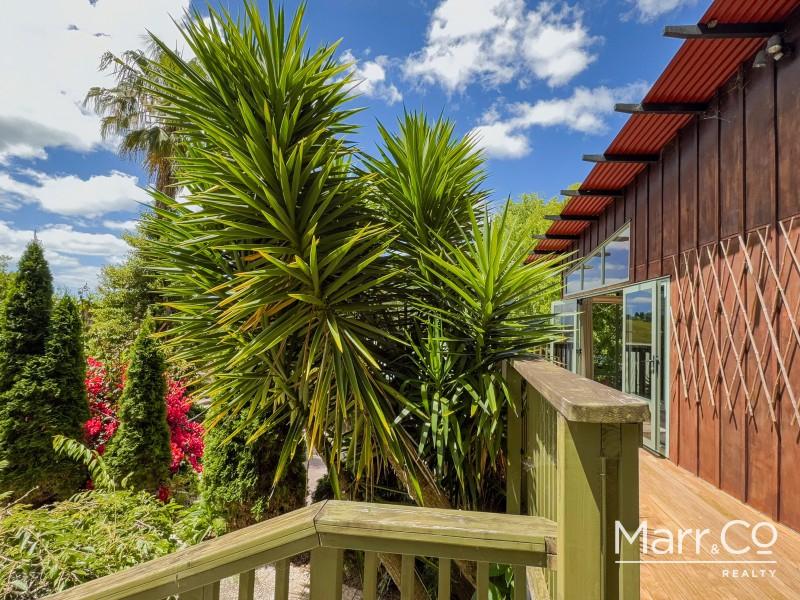 The property features numerous residential and ancillary buildings, including a generously sized colonial style home, a beautiful cottage, two studios, a large entertainment/conference building ideal for gatherings, and a boathouse featuring a spa, all set amidst picturesque landscaped gardens. Two post and rail fenced paddocks are currently accommodating horses, adding to the property’s versatility. Water is pumped from a reliable artesian source into two 20,000 litre tanks, gravity fed to the buildings.