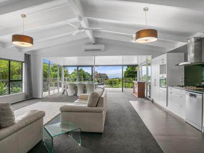 The house is very welcoming, with its open and large ranch-style verandah drawing you into its high ceilings, open spaces with original wood paneling, and massive hallway, which retain the character of yesteryears and add to the charm and ambience of the home. A large kitchen/dining area, containing a coal range, leads onto the front deck, providing that indoor/outdoor flow and, of course, the views that will captivate.