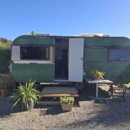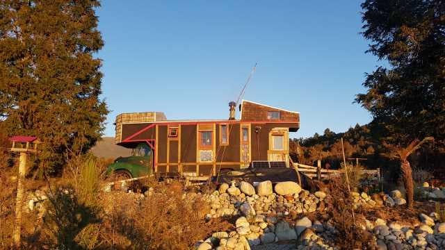 A beautiful old 1953 Austin Housetruck provides a cozy, comfortable place to curl up by the potbelly stove with your furbabies to read a book on a classic rainy West Coast day.