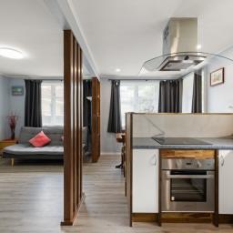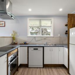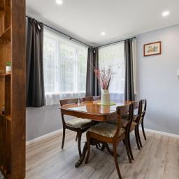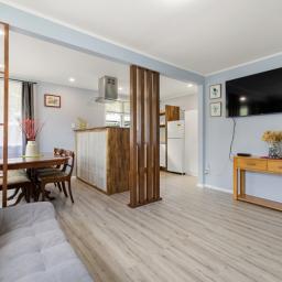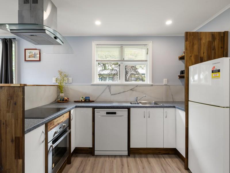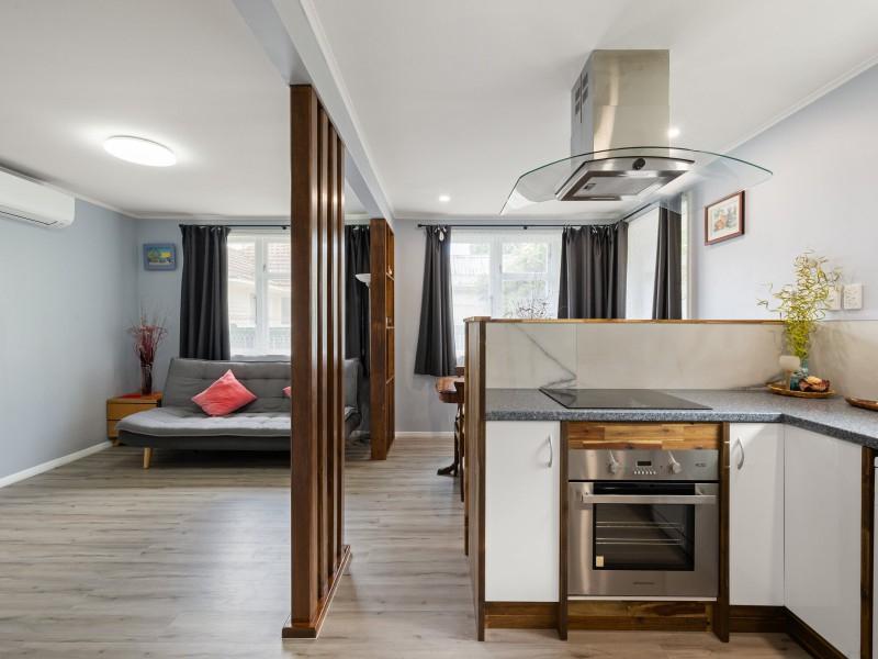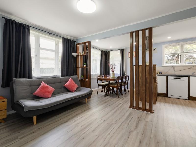 The updated kitchen offers a practical and stylish space with a dishwasher, induction cooktop, under-bench oven, and ample room for meal preparation. Adjoining the kitchen is a combined living and dining area, complete with a heat pump and a welcoming ambiance.