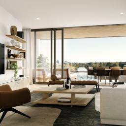Inside apartment 403 an open plan living space with timber floors opens onto a beautiful outdoor living area. Floor-to-ceiling glazing and over-height ceilings maximise natural light. The master bedroom features an ensuite and generous wardrobe space.
