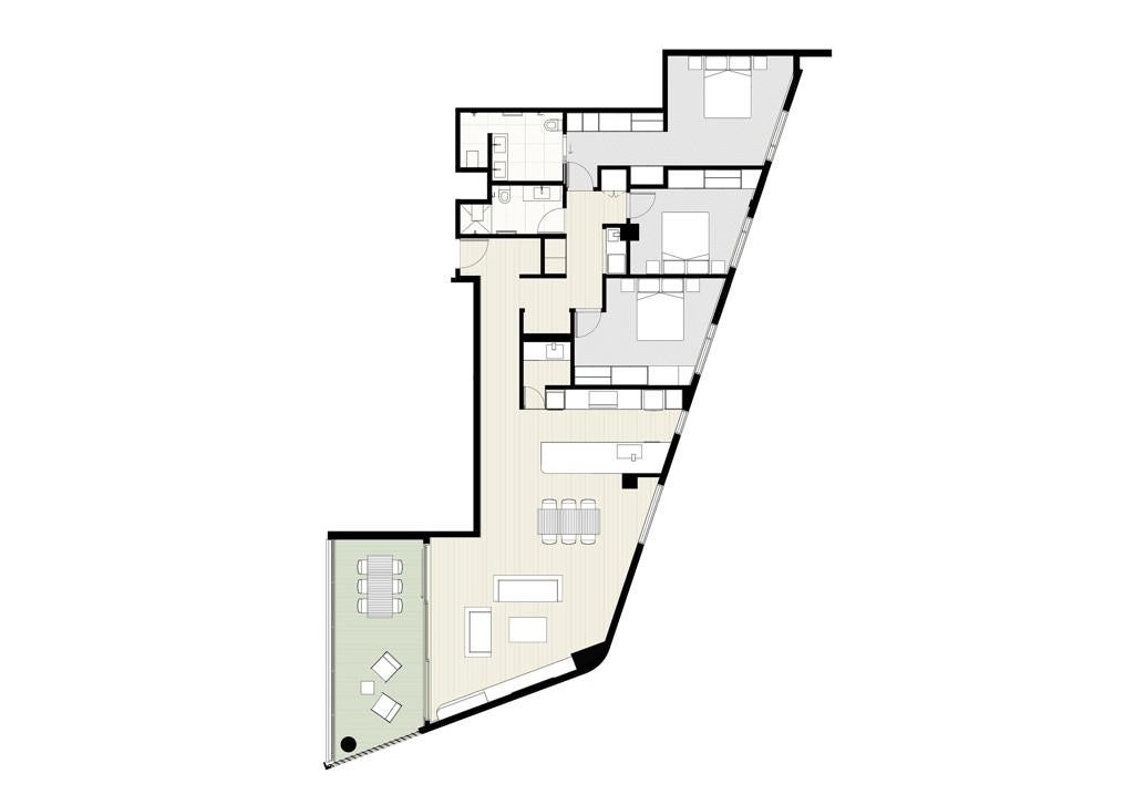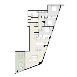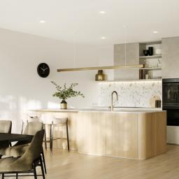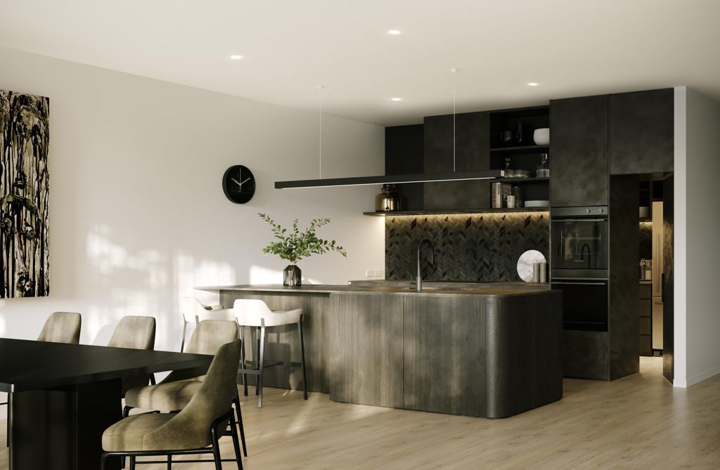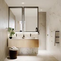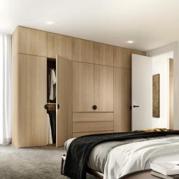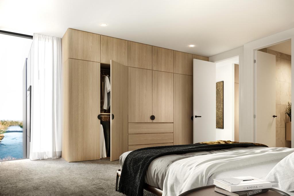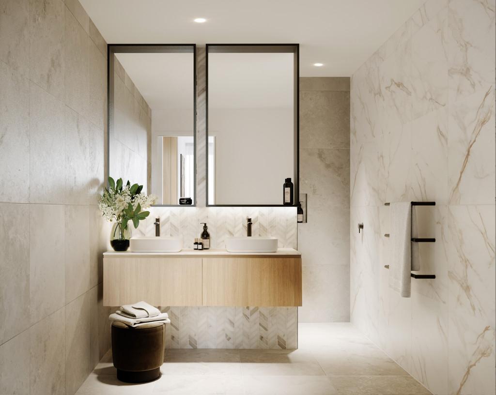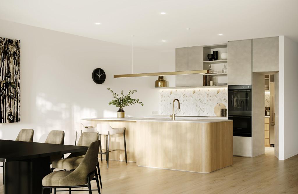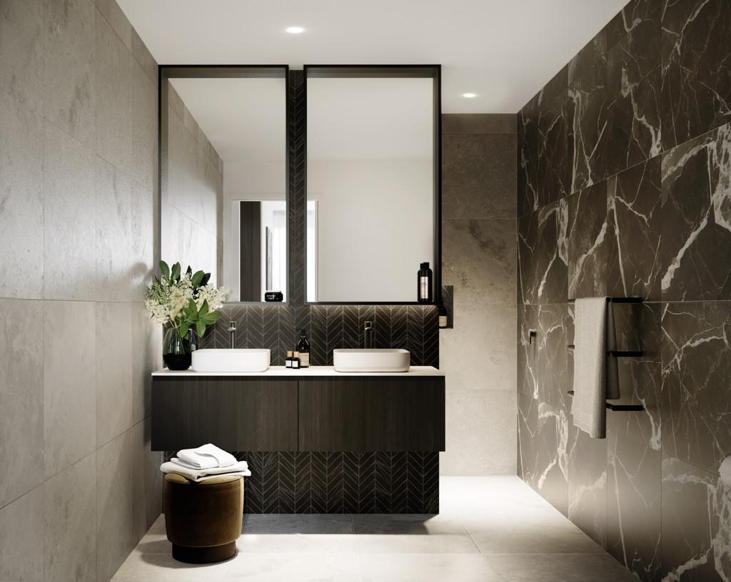 The kitchen boasts a scullery and has been holistically designed to complement the contemporary vision of the apartments. The combination of full height cabinetry, porcelain tile benchtops and premium appliances complement this refined aesthetic.