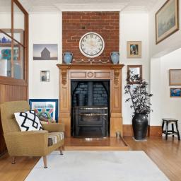 Spread over two levels, the property welcomes you with a formal entranceway to an expansive open-plan living area features stunning views, a cozy study nook, a heat pump, and a wood burner, with exposed brick, copper piping, a pressed metal ceiling, and a mantel adding striking character. The rustic kitchen boasts timber benchtops, a double butler's sink, and a walk-in pantry. The home is double glazed and triple brick to create a quiet and cozy environment.