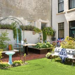 Outside, the cafe-style courtyard with built-in seating and planters provides a tranquil retreat, complemented by a flat lawn, easy-care plantings, a storage shed with workbench, laundry, and gardener's W/C. Newly installed wrought iron gates allow for convenient backyard access or parking.