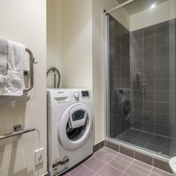 Includes a queen-size bed, tallboy cabinet, Samsung washing machine, and fridge.