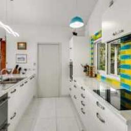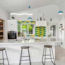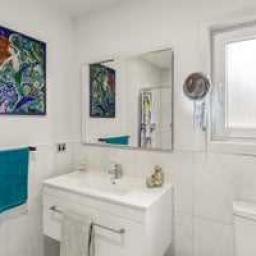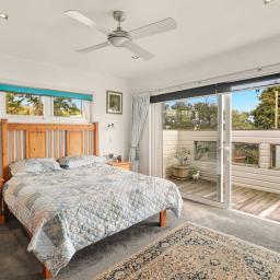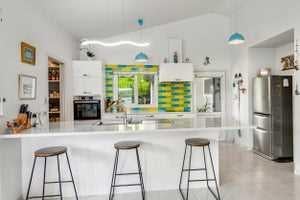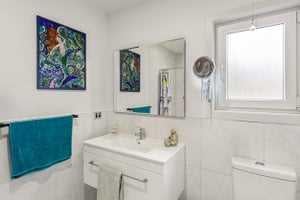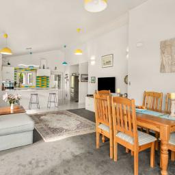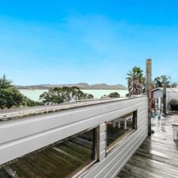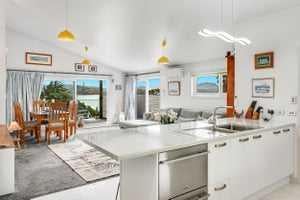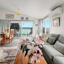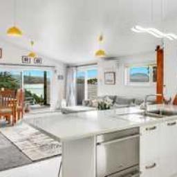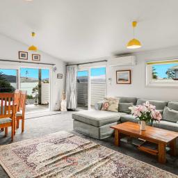 Step through the front door and immediately soak in the magnificent water views – even from the kitchen sink! The tiled entrance and hallway make it easy to keep things clean after a day at the beach. The home boasts two large bedrooms, two stylish bathrooms, and an open-plan living area with high ceilings that create a wonderful sense of light and space.