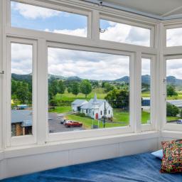 The well-maintained, solidly built house is accessed via a path from the fenced courtyard on the main street. Inside, you'll find high ceilings, beautifully polished floorboards, and a modern kitchen with a breakfast bar. The open-plan lounge features a stunning bay window seat with picturesque views of a cute church and a rural vista of poplar trees. The lounge is equipped for all seasons with a heat pump, wood burner, and an HRV system throughout the house.