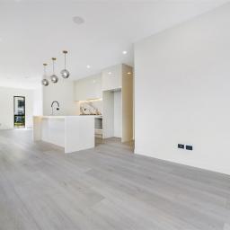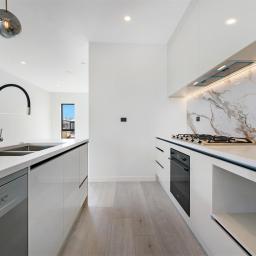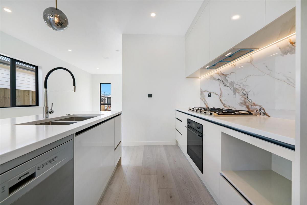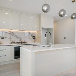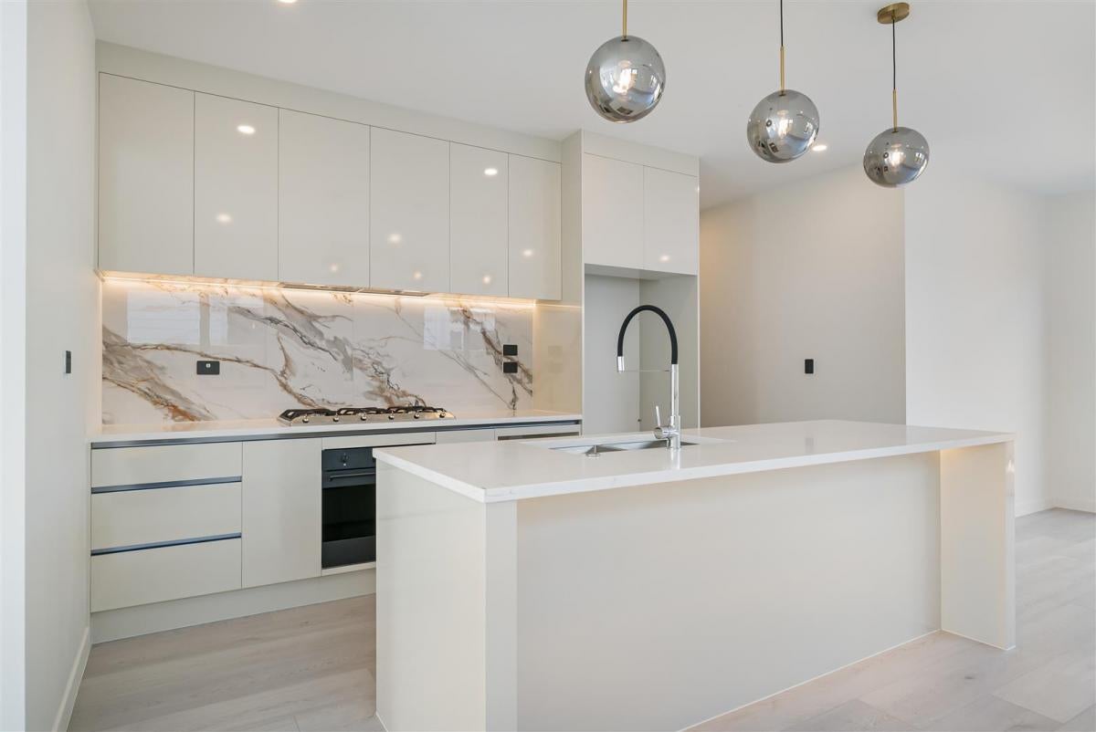 Designer kitchen with high-quality materials, engineered stone benchtops, and ample storage.