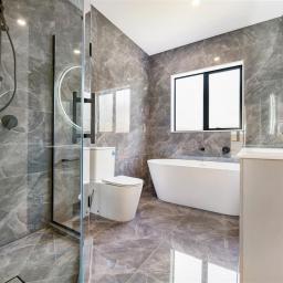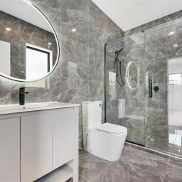 Luxuriously tiled bathrooms featuring Italian tiles and black tapware.