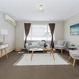 Inside, the home features two well-sized bedrooms, both equipped with built-in wardrobes. The modernised kitchen is spacious and functional, offering a dishwasher and ample storage, while seamlessly connecting to the inviting lounge area. The lounge enjoys a sunny aspect and is fitted with a heat pump, ensuring year-round comfort. The upgraded bathroom is generously sized.