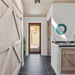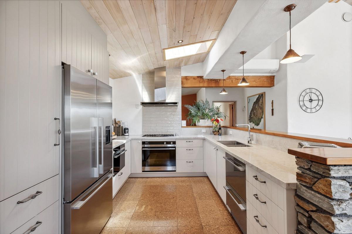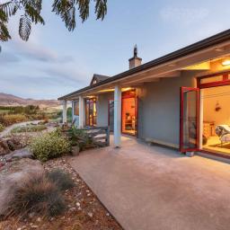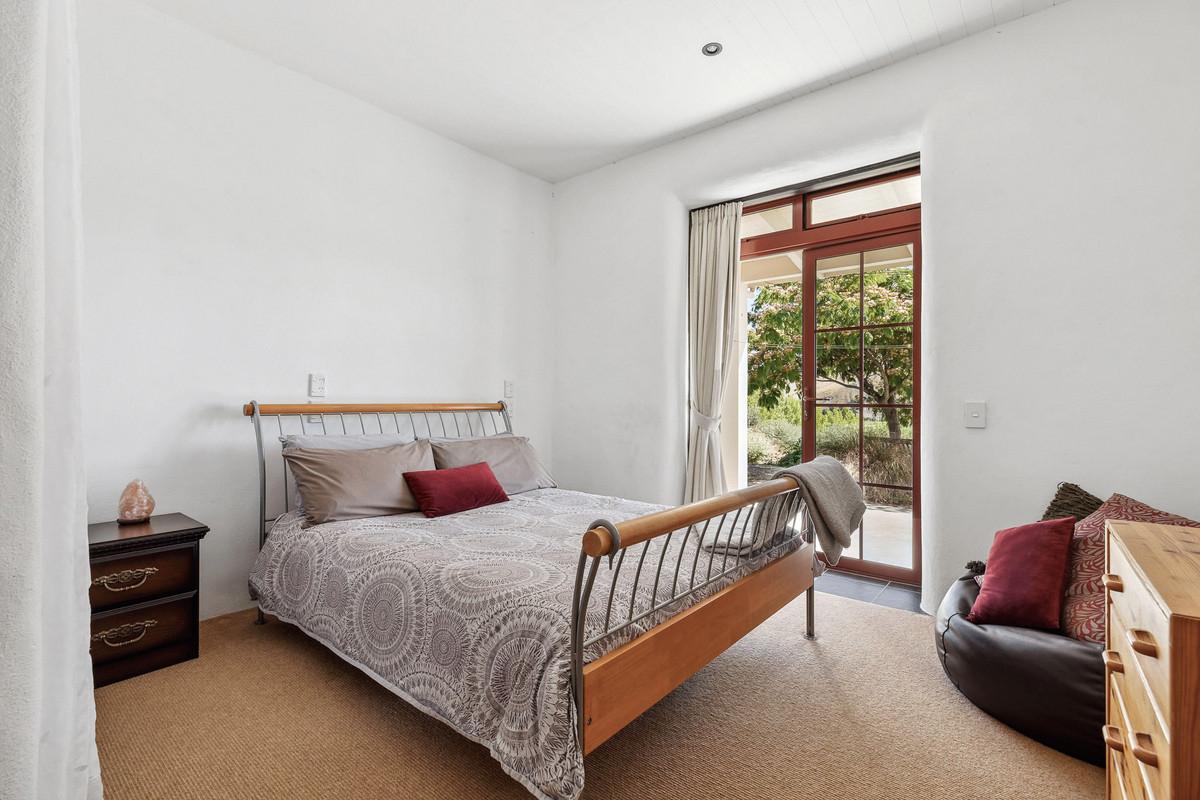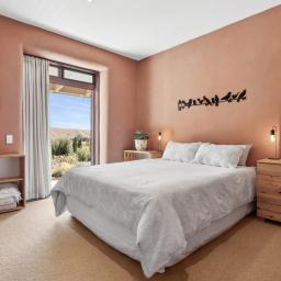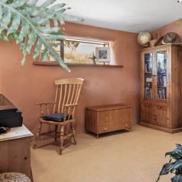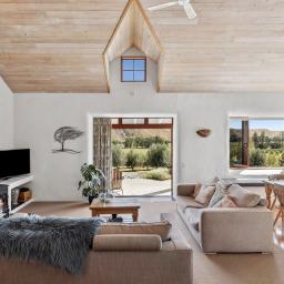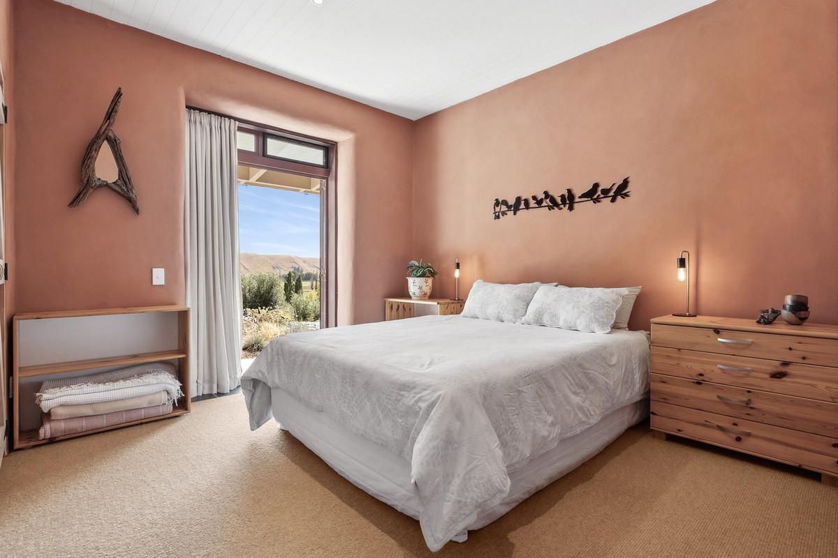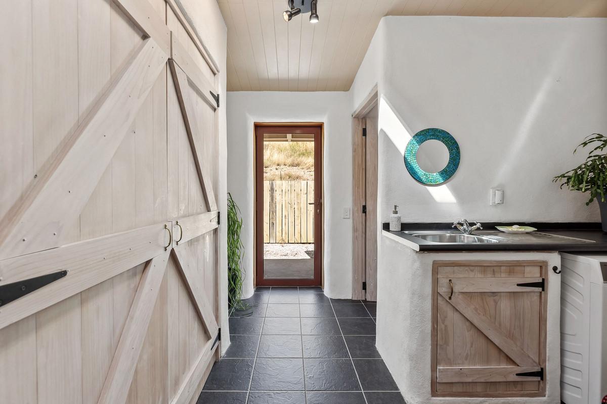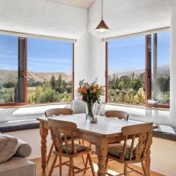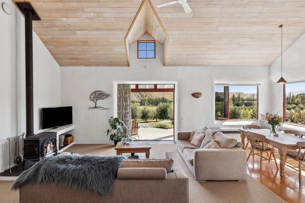 The character-filled straw bale home is designed for comfort and connection to its natural surroundings. Featuring three generously sized bedrooms, each with French doors opening onto the veranda, you'll wake up to stunning valley vistas and sun-filled spaces. The master suite boasts a walk-through wardrobe and ensuite, while the main bathroom features a charming clawfoot bath and separate shower. The modern cottage-style kitchen is a highlight, with a stunning schist feature wall, while the dining area includes a built-in window seat with sliding windows to take in the view. The lounge is warm and inviting, featuring a log burner, ceiling fan, and heat pump for year-round comfort. A spacious open office tucked around the corner offers versatility as a second lounge or creative space.