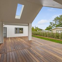 The heart of the home is the designer kitchen, featuring stone benchtops, a walk-in scullery with sink and ample power points, a Bosch oven with Home Connect functions, and a wine cooler. A sliding window server opens onto the expansive west-facing Kwila hardwood deck, which is partially covered, making it perfect for year-round use. The open-plan kitchen, dining, and family room enjoys plenty of natural light and direct access to the deck, creating a welcoming space for gatherings. A separate living room provides a private retreat.