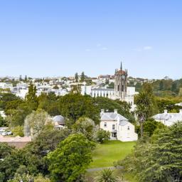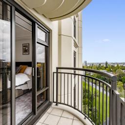 With breathtaking Albert Park and Sky Tower views, the immaculately presented 45 sqm (approx.) interior has plenty of natural light and a considered layout maximising economic spaces. A deep grey carpet anchors the living area with northwestern sun and a vibrant downtown panorama. This is open plan with a chic dual galley kitchen featuring ash toned timber cabinetry, marble slab walls, and engineered stone benchtops. Sliders stack back for entertaining on a curvilinear alfresco balcony also accessed from the adjacent double bedroom. This has a walk through wardrobe to Italian themed marble bathroom with bathtub, glass shower, substantial vanity storage and a wall hung toilet while the laundry has been cleverly integrated into kitchen cabinetry.