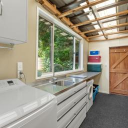 The property also includes a lockable single garage with timber lining, a carport, and a laundry area all connected by a covered walkway. Two water tanks and two woodsheds ensure you're well-equipped for all seasons, with a stand of pine trees that will keep you in firewood.