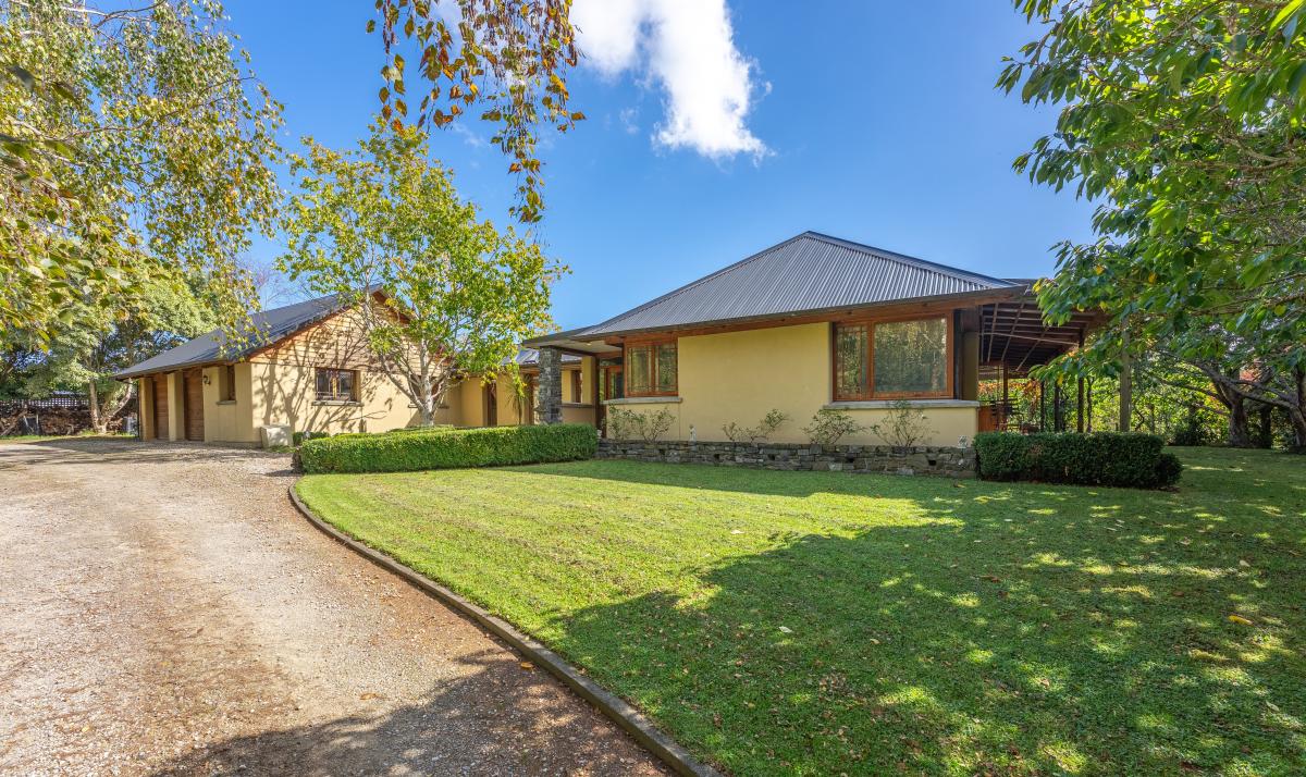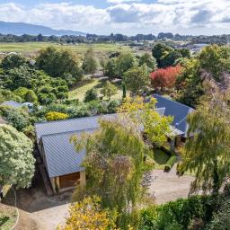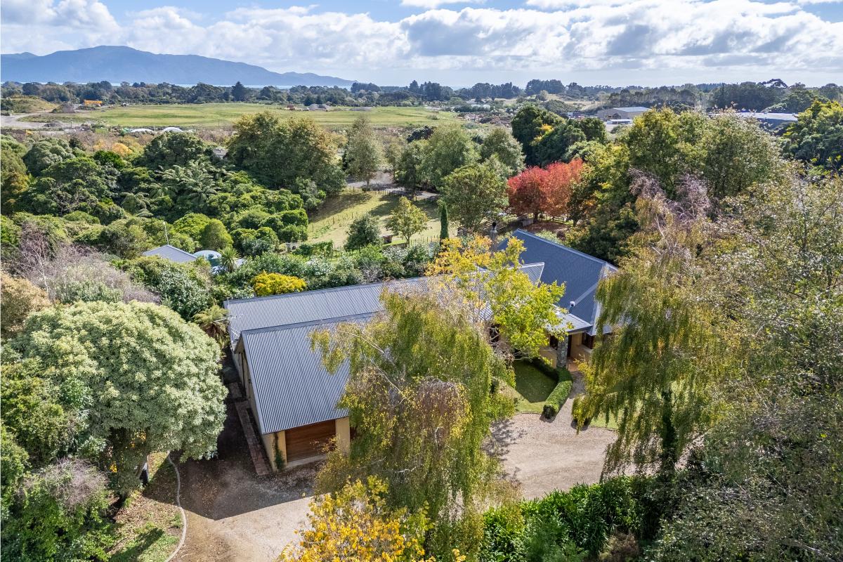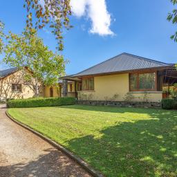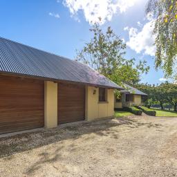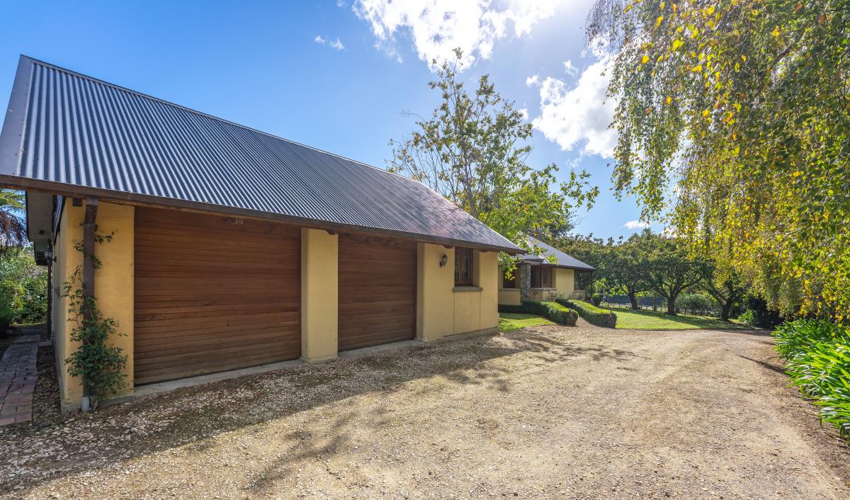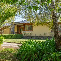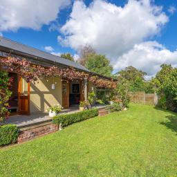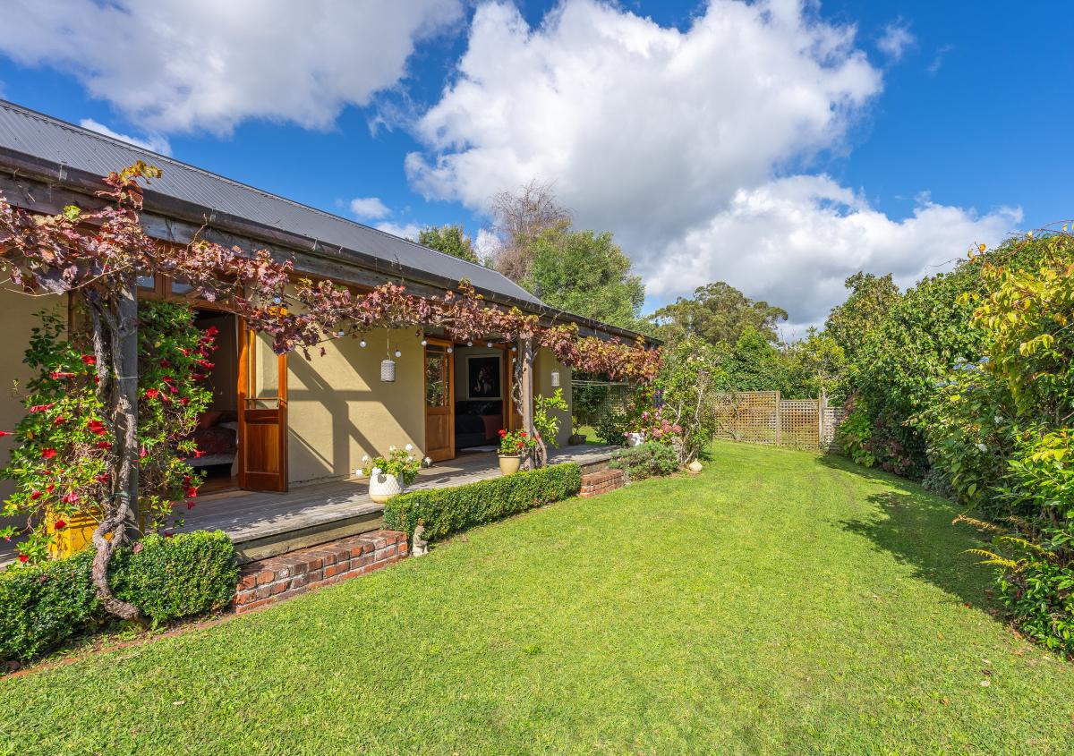 Inside, the natural beauty of Macrocarpa is featured throughout, from the flooring and exposed beams to the solid doors and frames, adding warmth and timeless appeal. The kitchen is ideal for entertainers, connecting effortlessly with the spacious living and dining area where French doors open to lush gardens and a wide veranda for easy indoor-outdoor flow. Three generous bedrooms include two with ensuites, all opening to the veranda. The main bathroom features a classic claw-foot bath, bringing a touch of vintage charm to everyday living.
