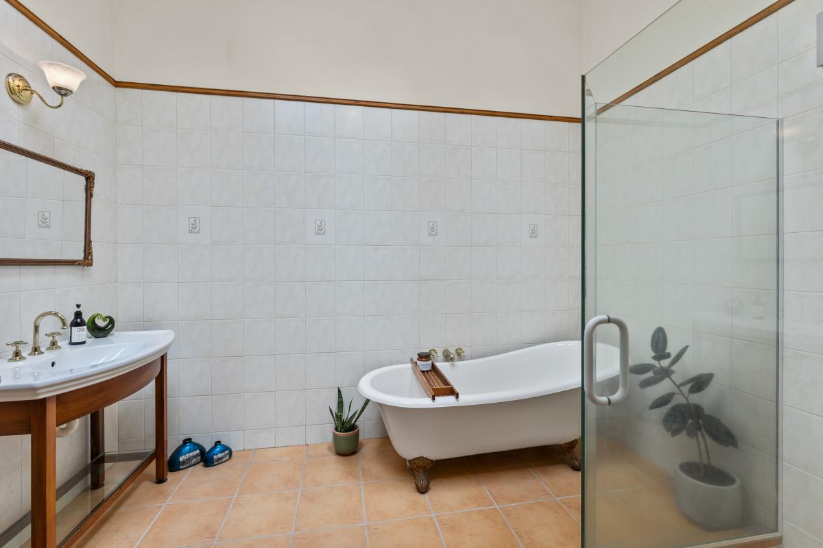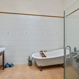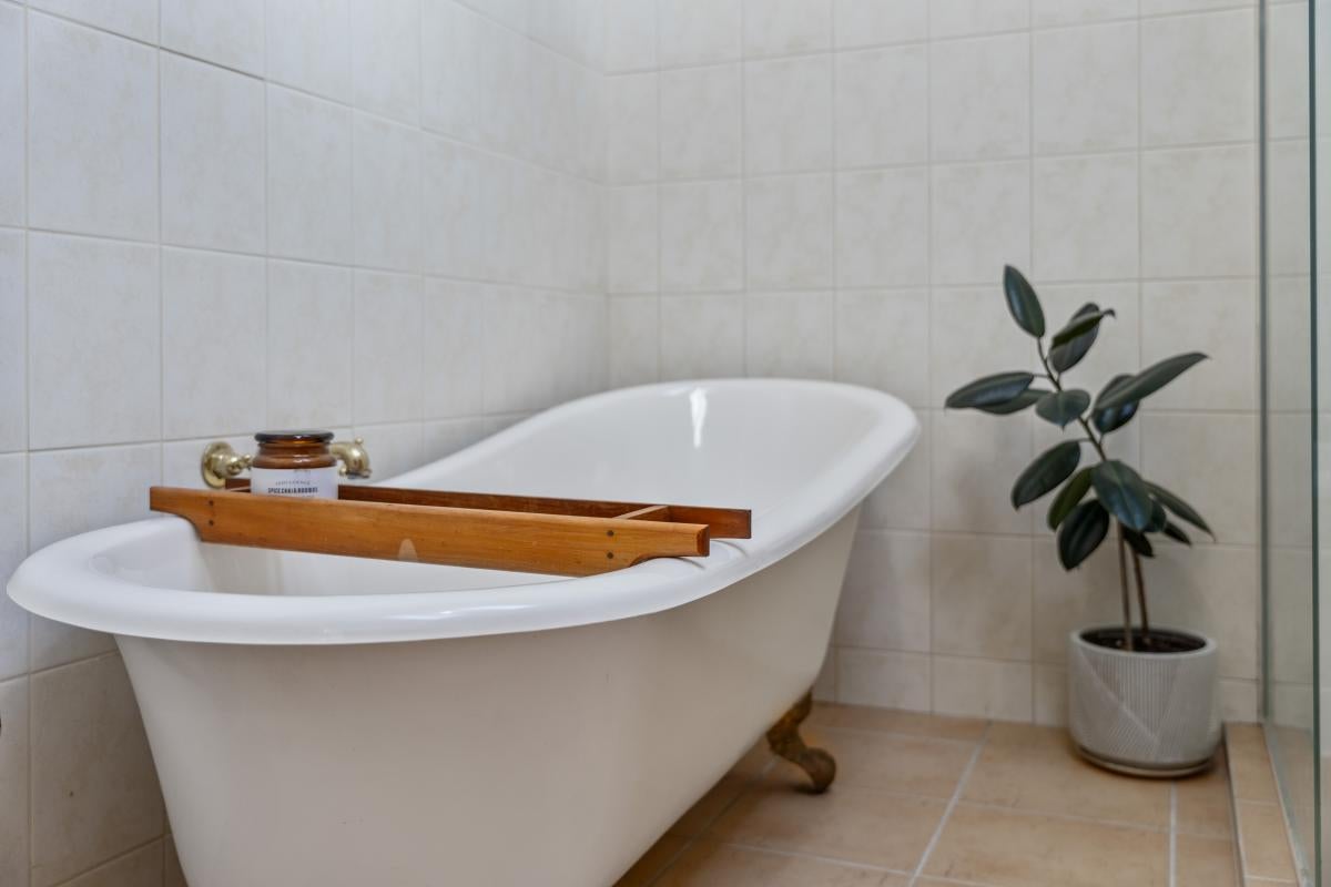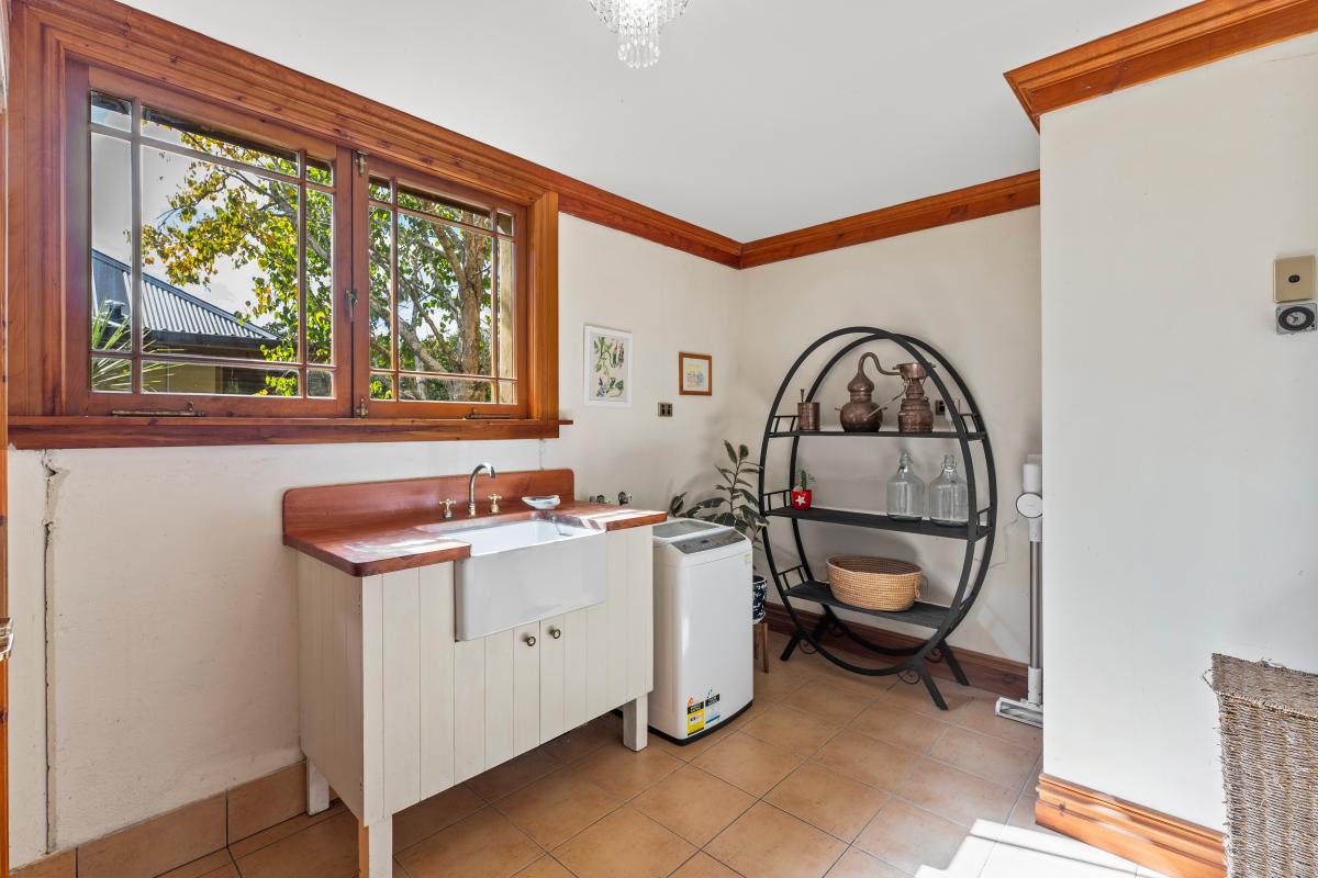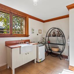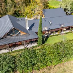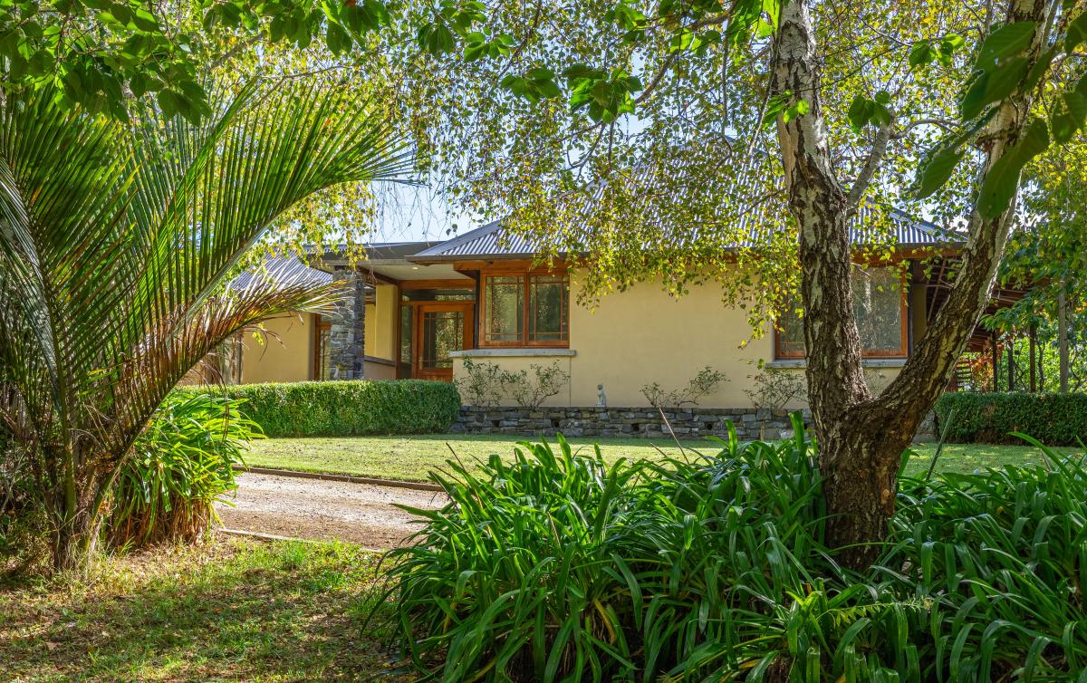 Inside, the natural beauty of Macrocarpa is featured throughout, from the flooring and exposed beams to the solid doors and frames, adding warmth and timeless appeal. The kitchen is ideal for entertainers, connecting effortlessly with the spacious living and dining area where French doors open to lush gardens and a wide veranda for easy indoor-outdoor flow. Three generous bedrooms include two with ensuites, all opening to the veranda. The main bathroom features a classic claw-foot bath, bringing a touch of vintage charm to everyday living.