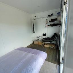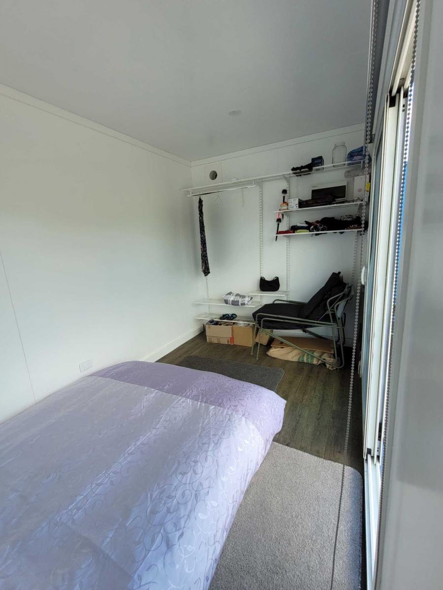 Sleepout has 240v power, is insulated and fitted with Elfin shelving at one end.