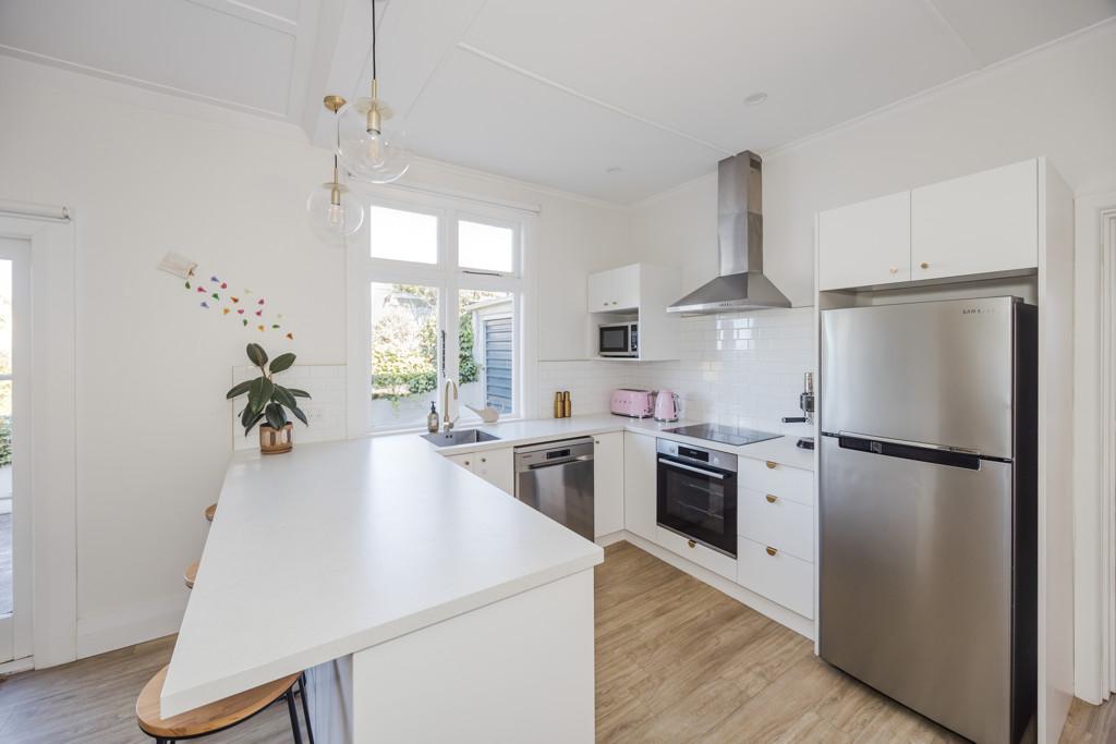The modern kitchen and bathroom are appointed with contemporary fixtures and finishes.