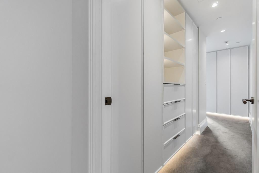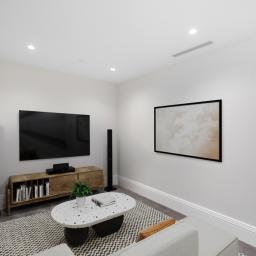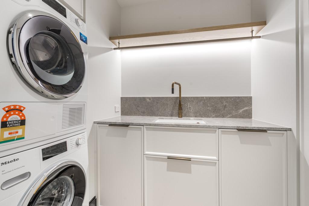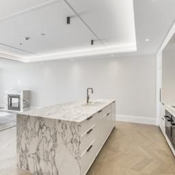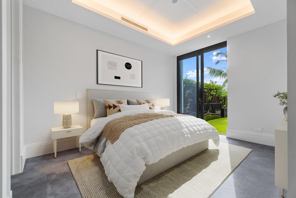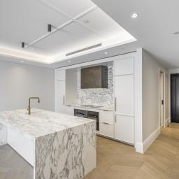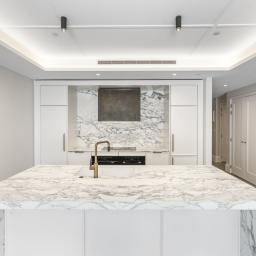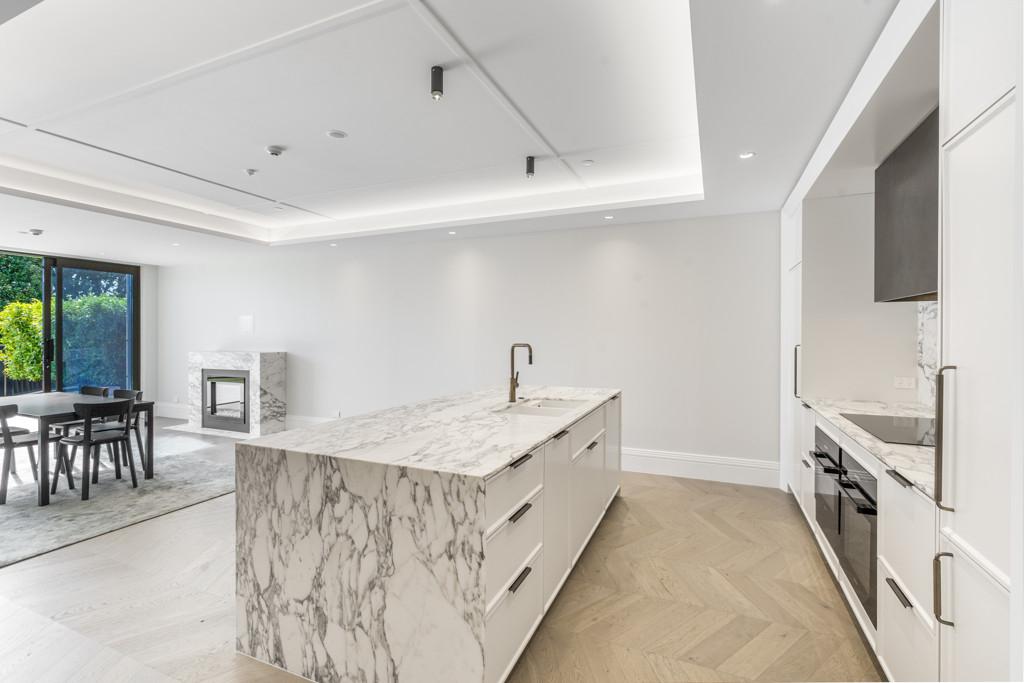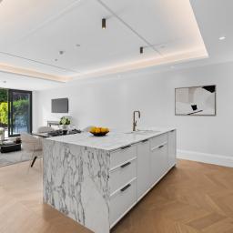 Once inside, generosity of space, light and quality impresses upon you. The open-plan living and dining area, anchored by decadent herringbone flooring, feels open and expansive through detailed recessed ceilings, lighting and full height double glazed joinery. The designer kitchen and fireplace share the use of Carrara marble and Miele appliances, ensuring chefs and entertainers alike are content. The luxurious master bedroom features a well-appointed en-suite, fluted glass, stone and underfloor heating. A large flexi room provides space for a media, cinema, home office or potentially second bedroom.