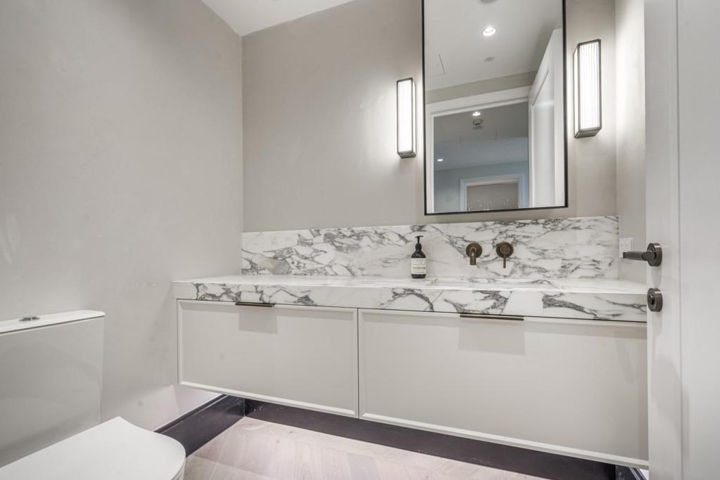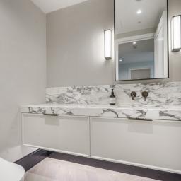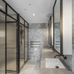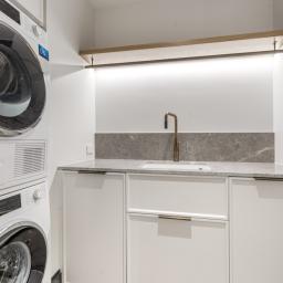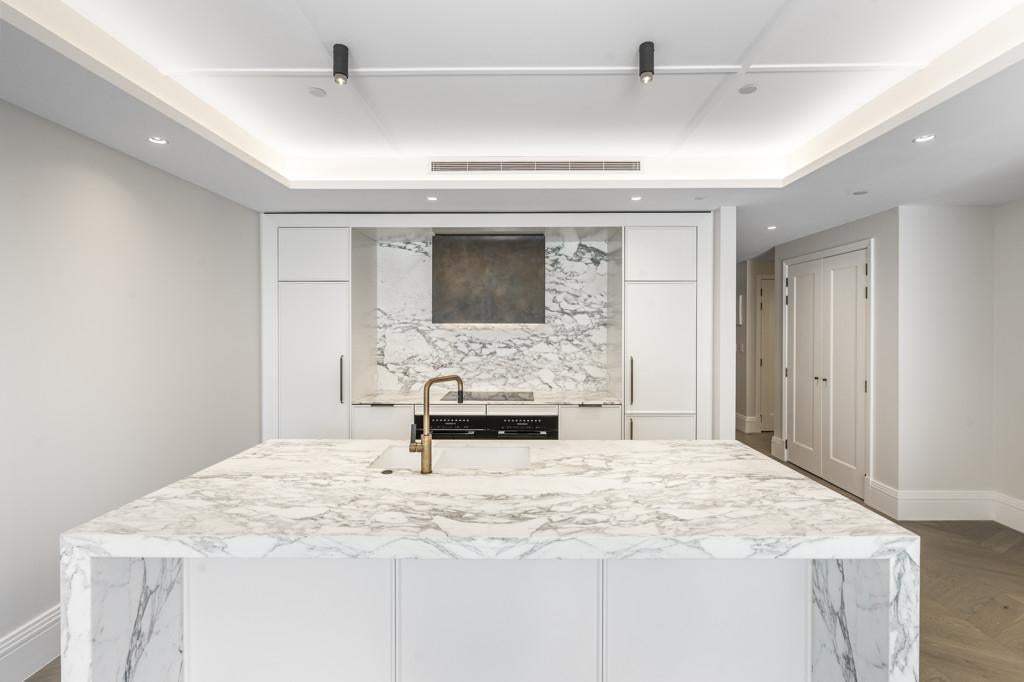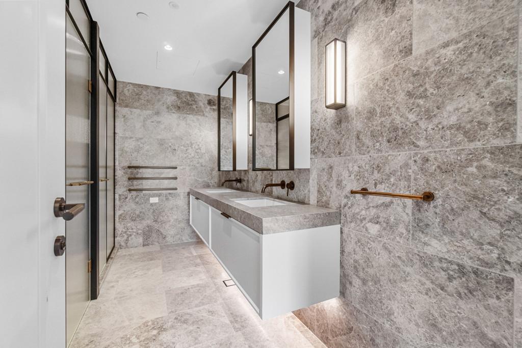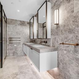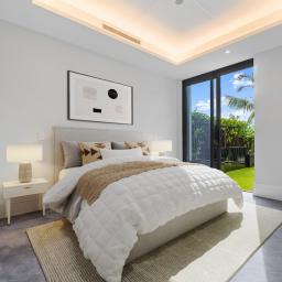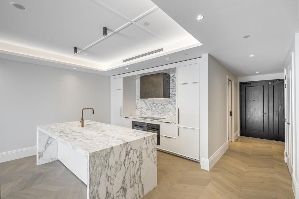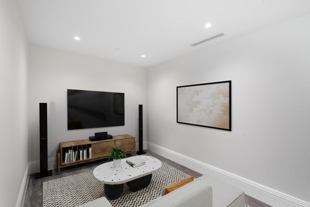 Once inside, generosity of space, light and quality impresses upon you. The open-plan living and dining area, anchored by decadent herringbone flooring, feels open and expansive through detailed recessed ceilings, lighting and full height double glazed joinery. The designer kitchen and fireplace share the use of Carrara marble and Miele appliances, ensuring chefs and entertainers alike are content. The luxurious master bedroom features a well-appointed en-suite, fluted glass, stone and underfloor heating. A large flexi room provides space for a media, cinema, home office or potentially second bedroom.