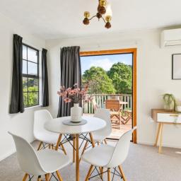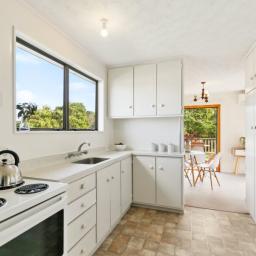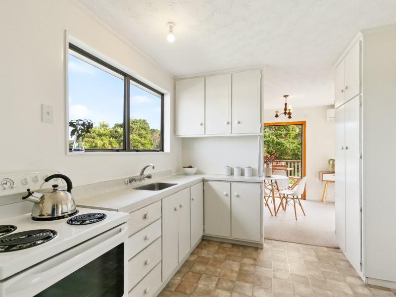 Brilliant open flow between living-dining-kitchen and French doors to a sunny deck overlooking the generous sized section and with a lovely green outlook across to the hills