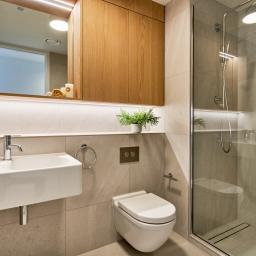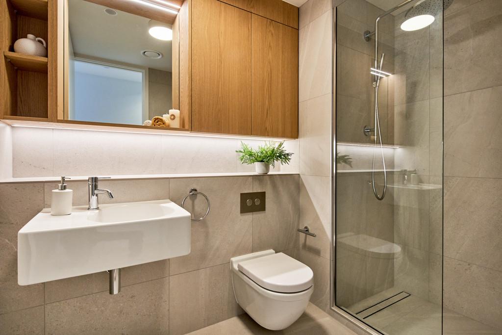 • Sleek contemporary bathroom with heated flooring and floor-to-ceiling porcelain tiles