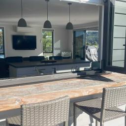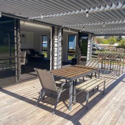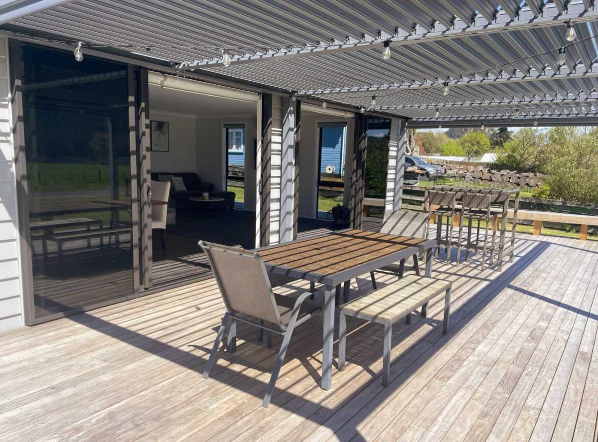 - A large open-plan living area that seamlessly flows onto an outside alfresco deck complete with louvre roof and blinds all around.