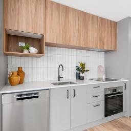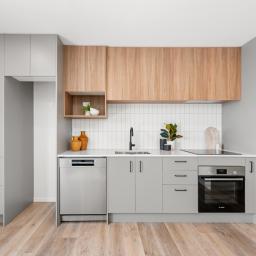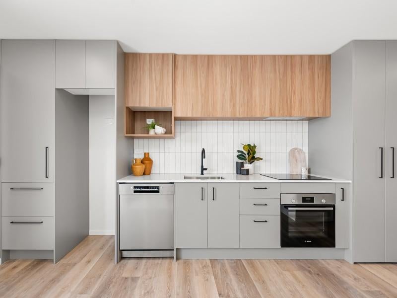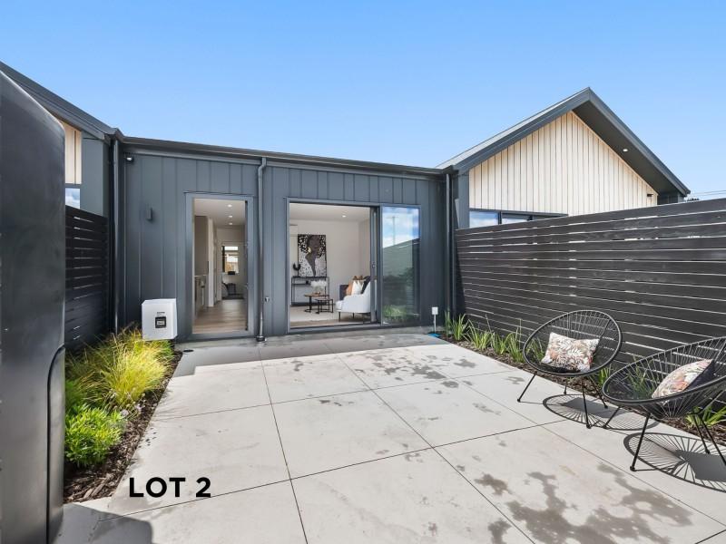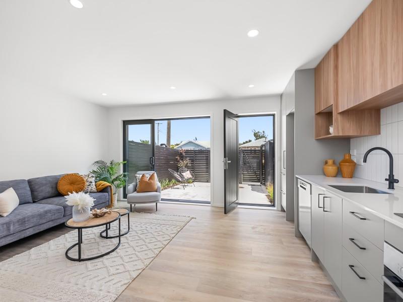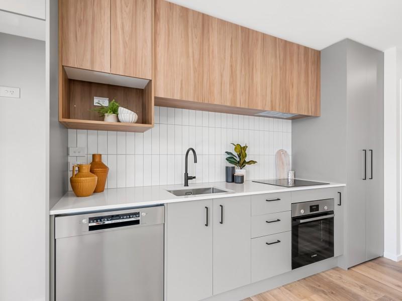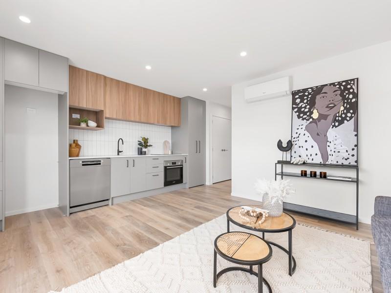 Step inside and enjoy light-filled interiors enhanced by striking raked ceilings that create an immediate sense of openness. This home features two bedrooms, open plan living and dining, and a sleek kitchen complete with Bosch appliances, engineered stone benchtops, and induction hobs. Cleverly designed hideaway laundry is seamlessly integrated, ensuring effortless living.