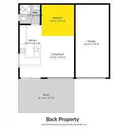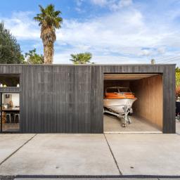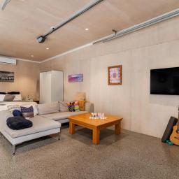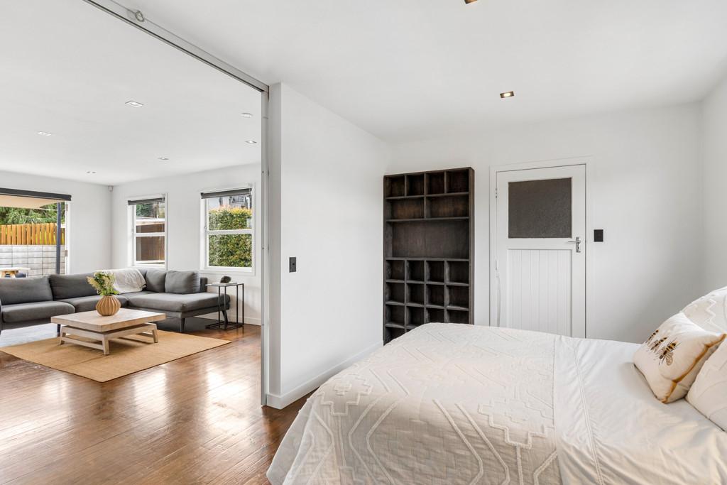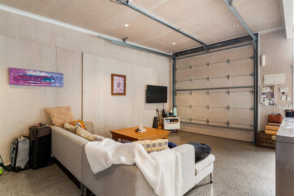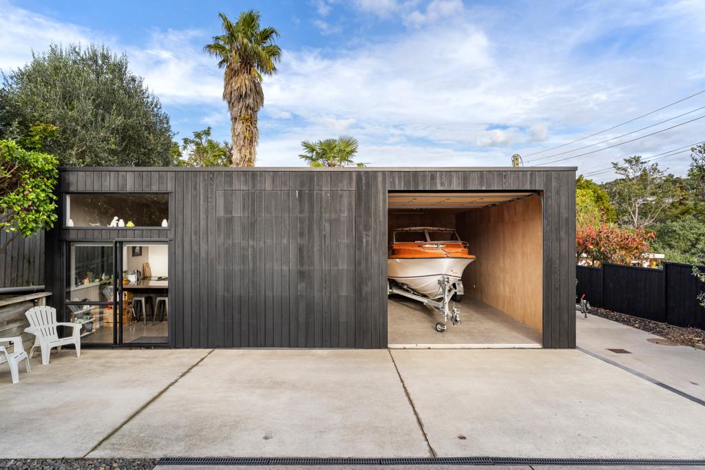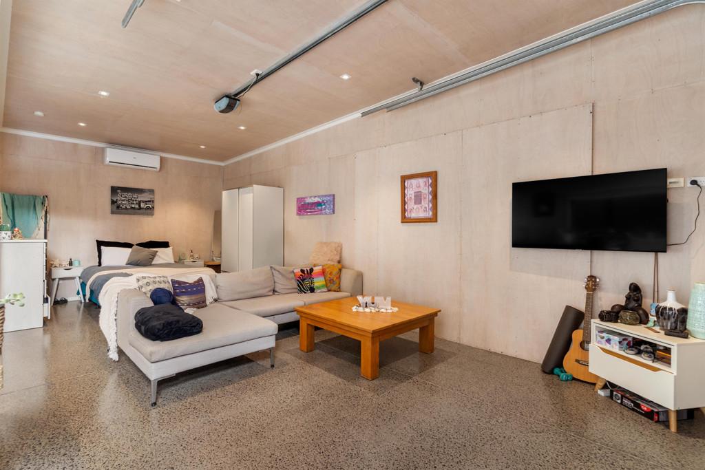 To the rear sits a large studio-style dwelling, complete with open-plan kitchen, dining, living, and bedroom zones, plus a full bathroom and garage space.
