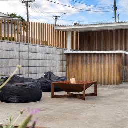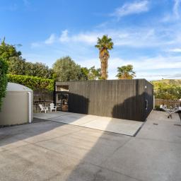 In the middle of the section is a modern sleepout with an open-plan bedroom and living space, a kitchenette, and bathroom - ideal for guests, extended family, or rental income.