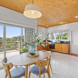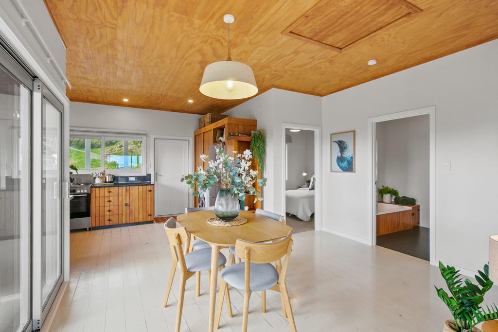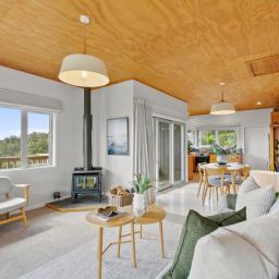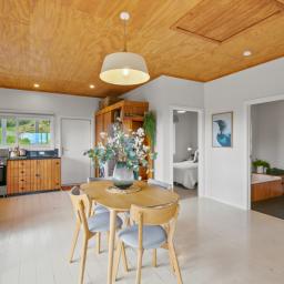 From the moment you arrive, a calming sense of nature prevails. The 2012 built cottage-style home nestles seamlessly into its natural surroundings, exuding character while offering the convenience of modern living. Inside, the open-plan layout flows effortlessly to the outdoors, where expansive sun-drenched decking and sheltered nooks are ideal for entertaining or simply soaking in the peaceful rural outlook, with views from the mountain to the sea. Two spacious double bedrooms and carefully considered design details create a warm and welcoming interior.