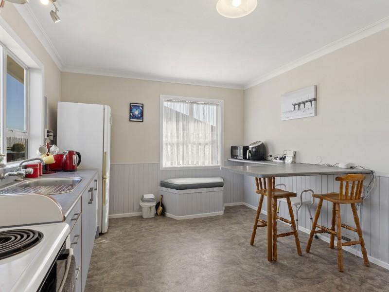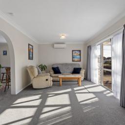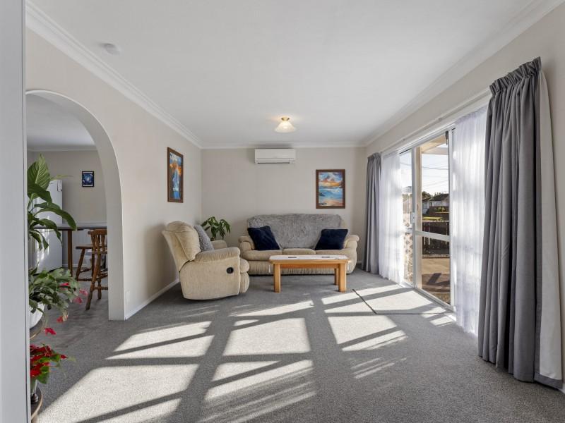 The light-filled open-plan kitchen and dining area features a pantry, electric stove, and breakfast bar—ideal for family meals and casual entertaining. A separate north-facing lounge captures all-day sun and includes a heat pump to keep you cozy year-round. The home is fully insulated for added warmth and energy efficiency.